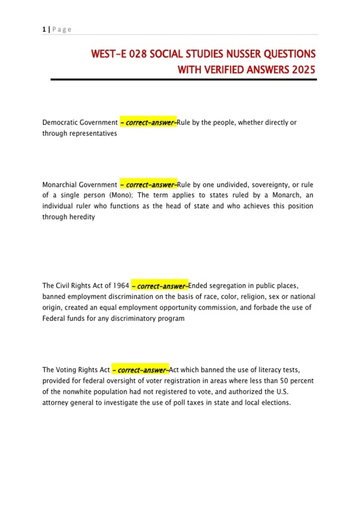 The WEST-E 028 Social Studies Questions with Verified Answers 2025 resource provides accurate, exam-style questions with correct answers to support teacher certification success. Covering U.S. history, world history, geography, civics and government, economics, and social studies pedagogy, this study guide strengthens content mastery, improves test readiness, and builds confidence for passing the WEST-E 028 Social Studies endorsement examination