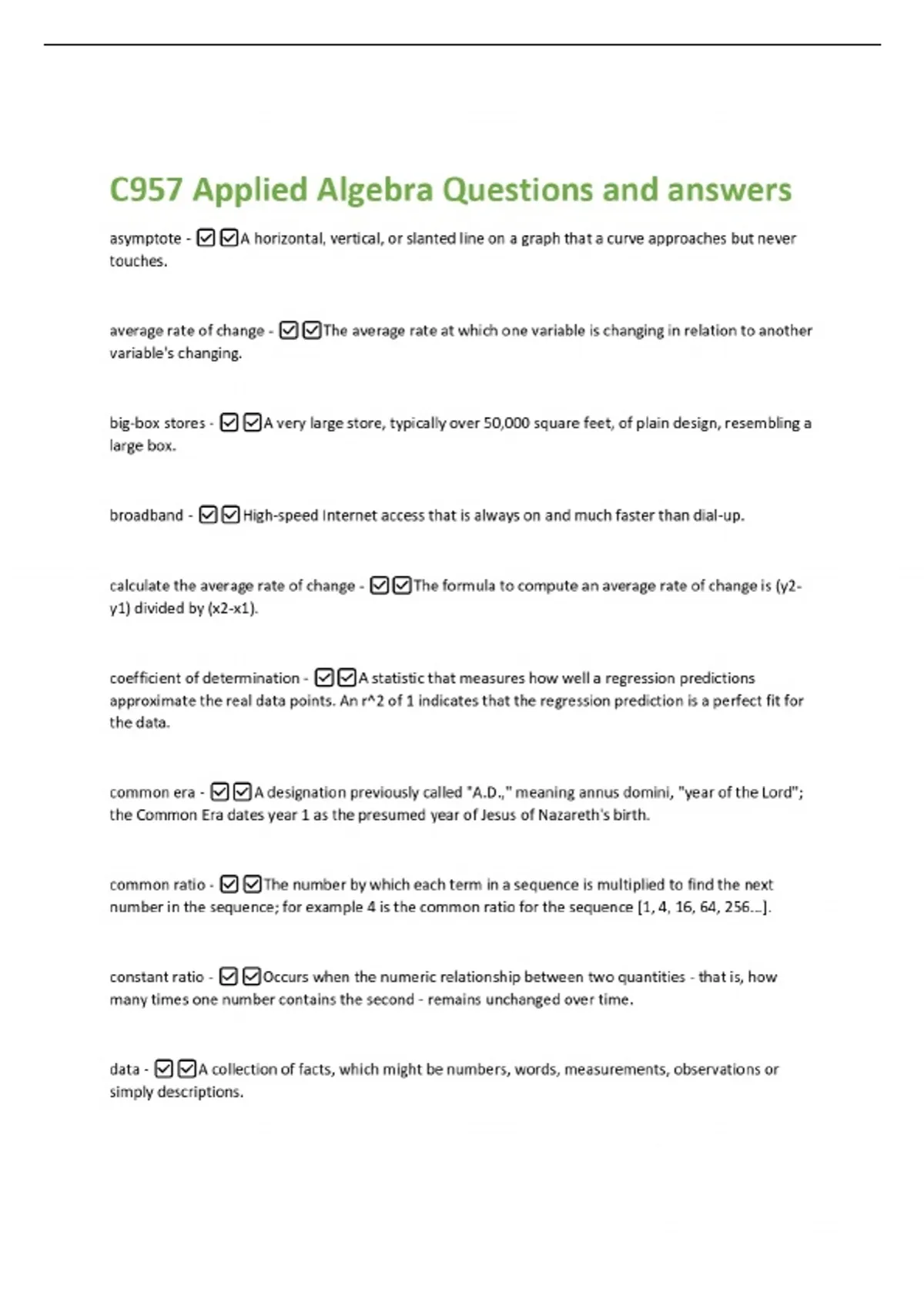 C957 Applied Algebra Questions and answers asymptote - A horizontal, vertical, or slanted line on a graph that a curve approaches but never touches. average rate of change - The average rate at which one variable is changing in relation to another variable's changing. big-box stores - A very large store, typically over 50,000 square feet, of plain design, resembling a large box. broadband - High-speed Internet access that is always on and much faster than dial-up. calculate the average rate of change - The formula to compute an average rate of change is (y2 y1) divided by (x2-x1).