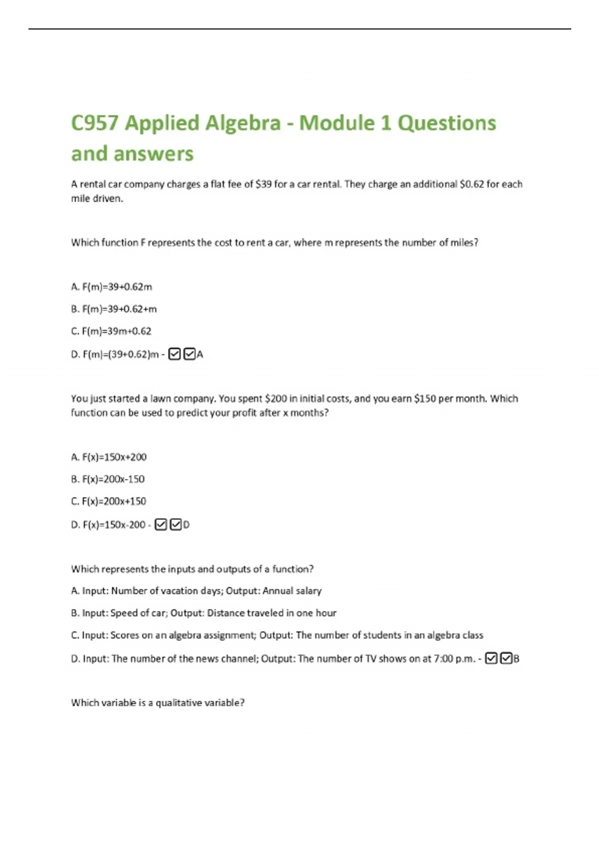 C957 Applied Algebra - Module 1 Questions and answers A rental car company charges a flat fee of $39 for a car rental. They charge an additional $0.62 for each mile driven. Which function F represents the cost to rent a car, where m represents the number of miles? A. F(m)=39+0.62m B. F(m)=39+0.62+m C. F(m)=39m+0.62 D. F(m)=(39+0.62)m - A You just started a lawn company. You spent $200 in initial costs, and you earn $150 per month. Which function can be used to predict your profit after x months?