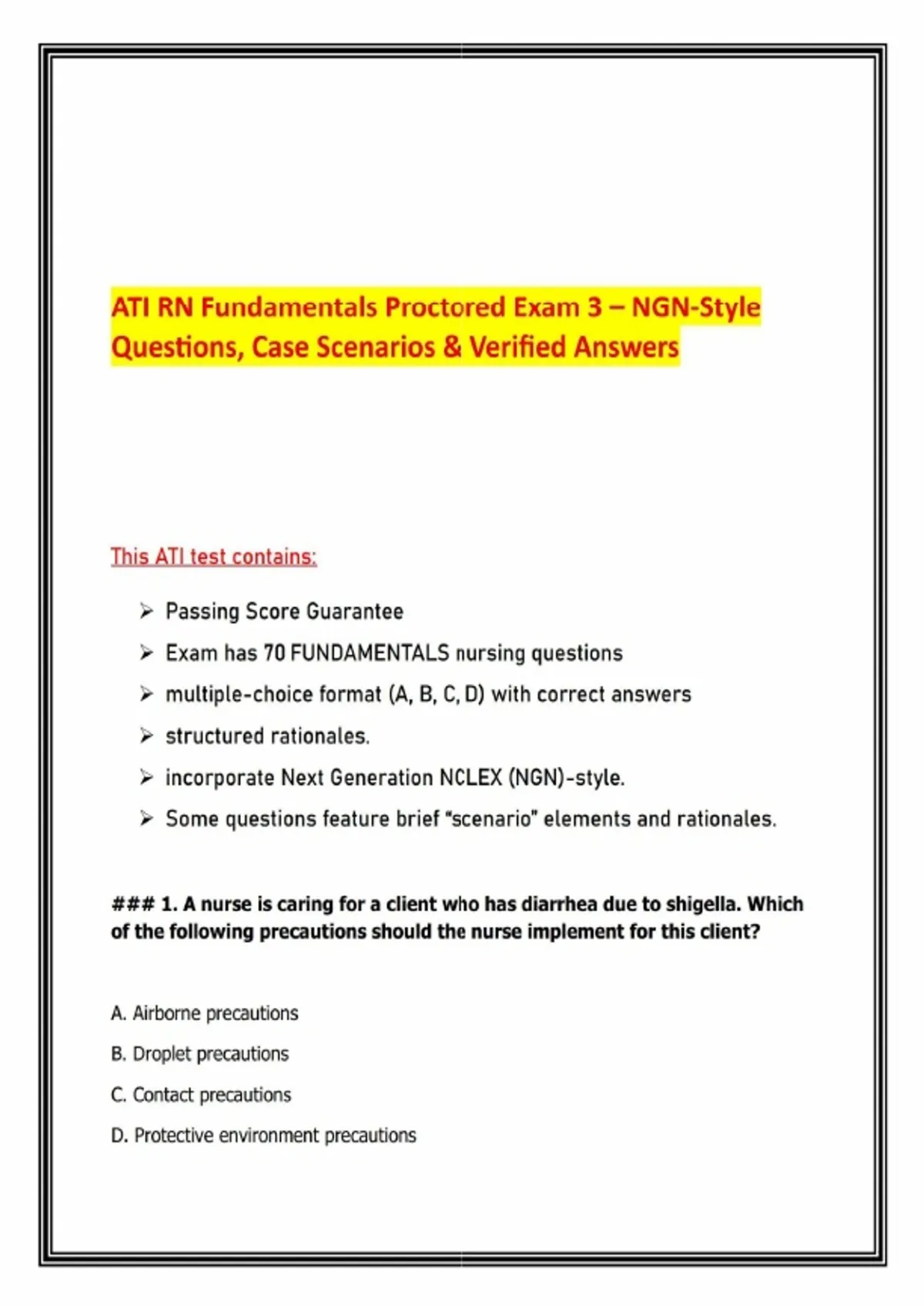 ATI RN Fundamentals Proctored Exam 3 – NGN Style Questions, Case Scenarios & Verified AnswersThis ATI RN Fundamentals Proctored Exam 3 Study Resource contains actual exam‑style questions and answers designed to help nursing students prepare for ATI proctored exams and NCLEX. It incorporates Next Generation NCLEX (NGN) case scenarios with structured rationales to ensure deep understanding and exam success. What’s Inside: - 70 Fundamentals Nursing Questions in multiple‑choice format (A, B, C, D) - Verified Correct Answers with concise rationales - NGN‑Style Case Scenarios to mirror the latest ATI and NCLEX exam formats - High‑yield topics covered: - Infection control & precautions (contact precautions for shigella, TB airborne protocols, protective environments for stem cell transplants) - Pain assessment dimensions (quality, location, duration, relieving factors) - Postoperative care priorities (urinary output, vital signs, hemorrhagic shock escalation) - Sleep hygiene recommendations (consistent wake‑up times, caffeine avoidance) - Electrolyte imbalances (hyponatremia signs such as abdominal cramping) - Restraint safety (padding wrists, frequent removal, tying to bed frame not rails) - Latex allergy precautions (covering cords, latex‑free supplies) - Herbal supplement use (echinacea for immune support, provider consultation for safety) - Delegation principles (AP tasks vs. nursing judgment tasks in stroke care) - Ethical dilemmas & palliative care readiness Key Benefits: - Structured rationales explain why each answer is correct - Incorporates NGN‑style case scenarios for realistic practice - Designed to help students achieve a Level 2 or higher on ATI Fundamentals exams - Perfect for ATI prep, NCLEX review, and nursing school succes
