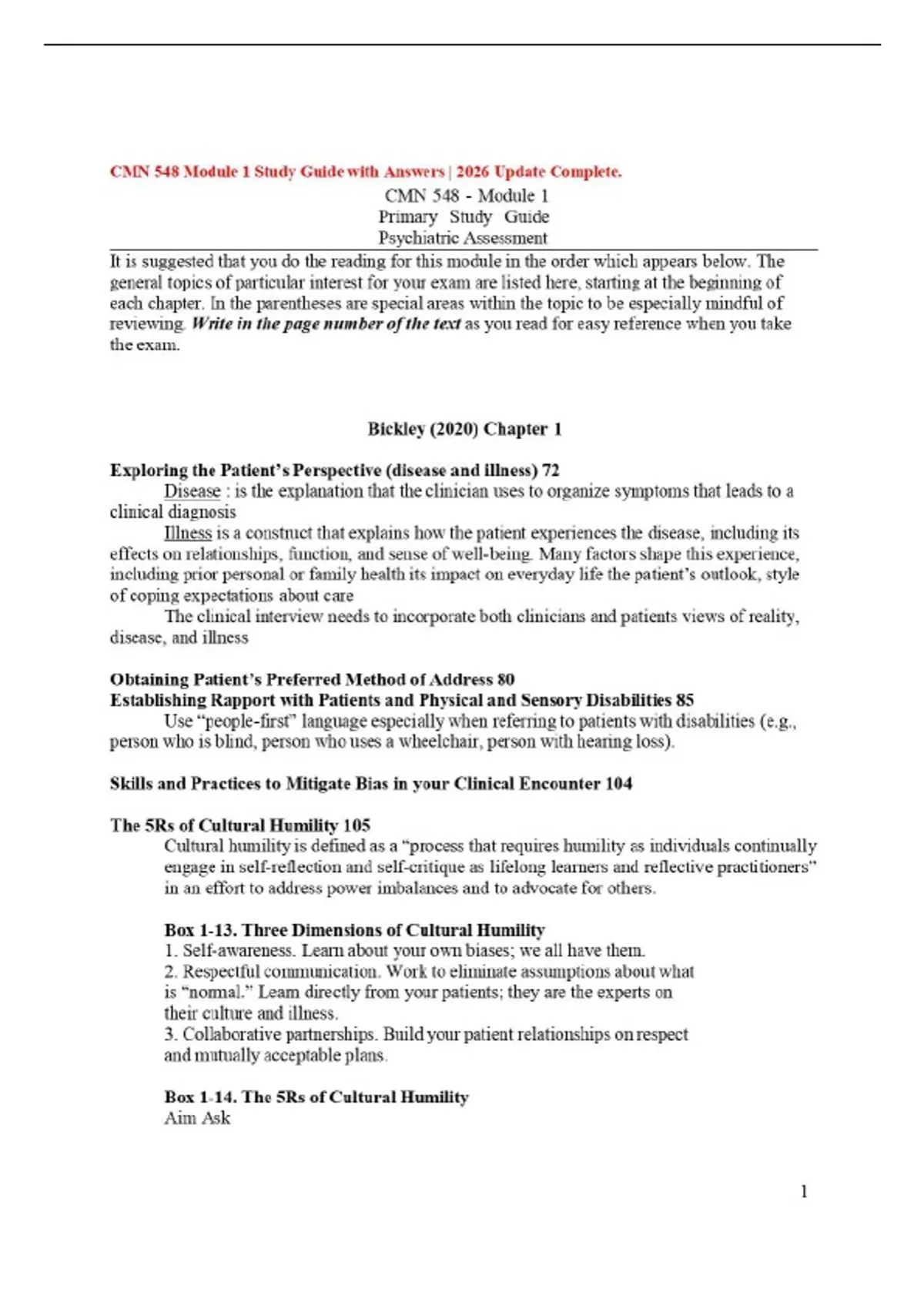Summary CMN 548 Module 1 Study Guide with Answers | 2026 Update Complete.