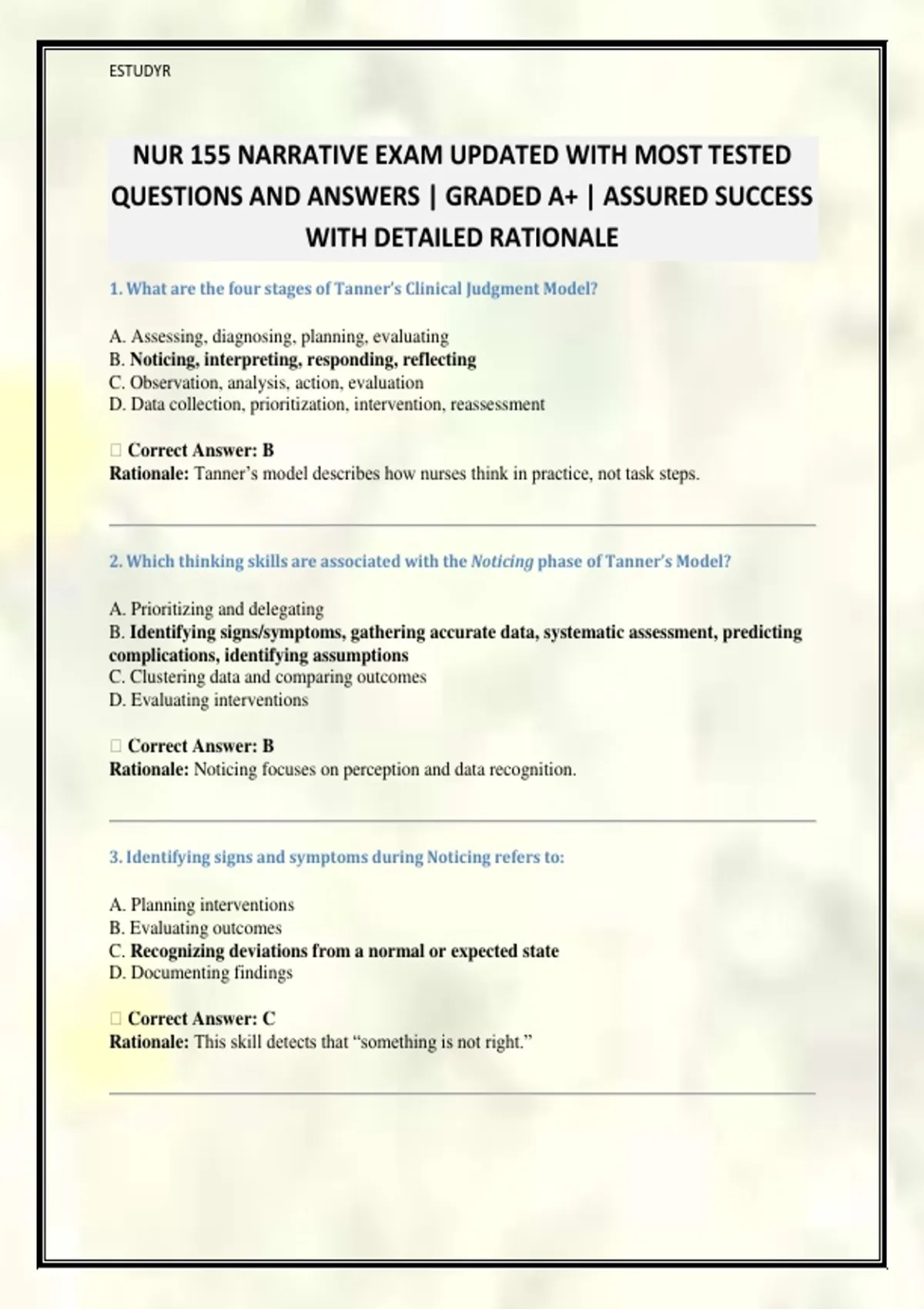 NUR 155 NARRATIVE EXAM UPDATED WITH MOST TESTED