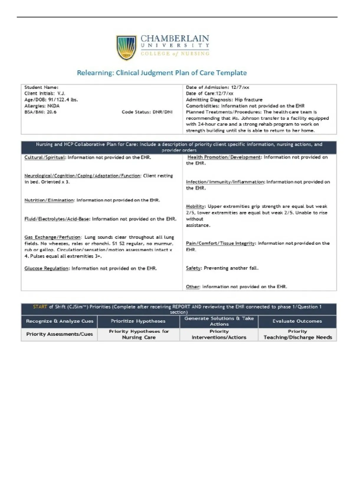 This document contains a comprehensive nursing plan of care for NR 446, centered on the patient case of Viola Johnson. It includes patient assessment data, nursing diagnoses, goals, interventions, and evaluations aligned with evidence-based nursing practice and course requirements.
