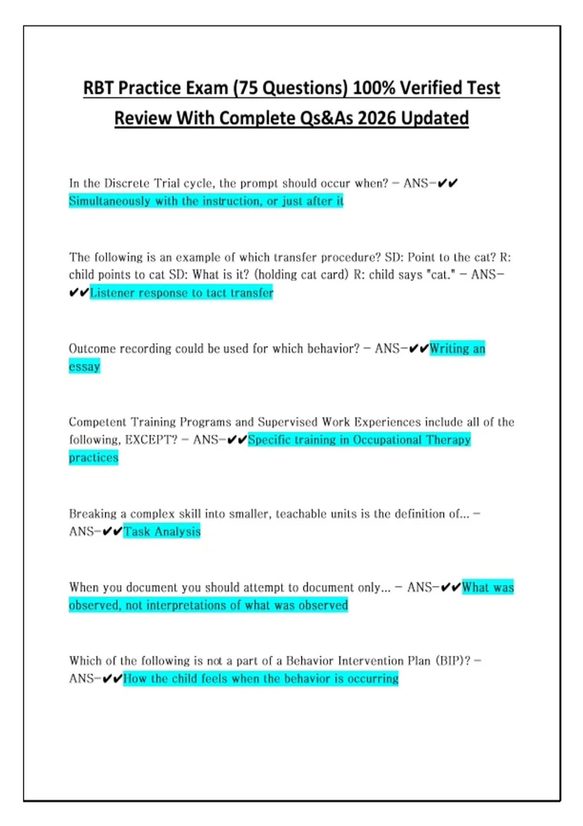 RBT Practice Exam (75 Questions) 100% Verified Test Review With Complete Qs&As 2026 Updated In the Discrete Trial cycle, the prompt should occur when? - ANS-Simultaneously with the instruction, or just after it The following is an example of which transfer procedure? SD: Point to the cat? R: child points to cat SD: What is it? (holding cat card) R: child says "cat." - ANS-Listener response to tact transfer Outcome recording could be used for which behavior? - ANS-Writing an essay Competent Training Programs and Supervised Work Experiences include all of the following, EXCEPT? - ANS-Specific training in Occupational Therapy ... CONTINUES....