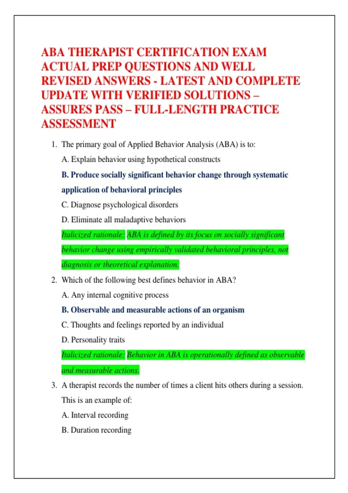 Italicized rationale: Behavior in ABA is operationally defined as observable