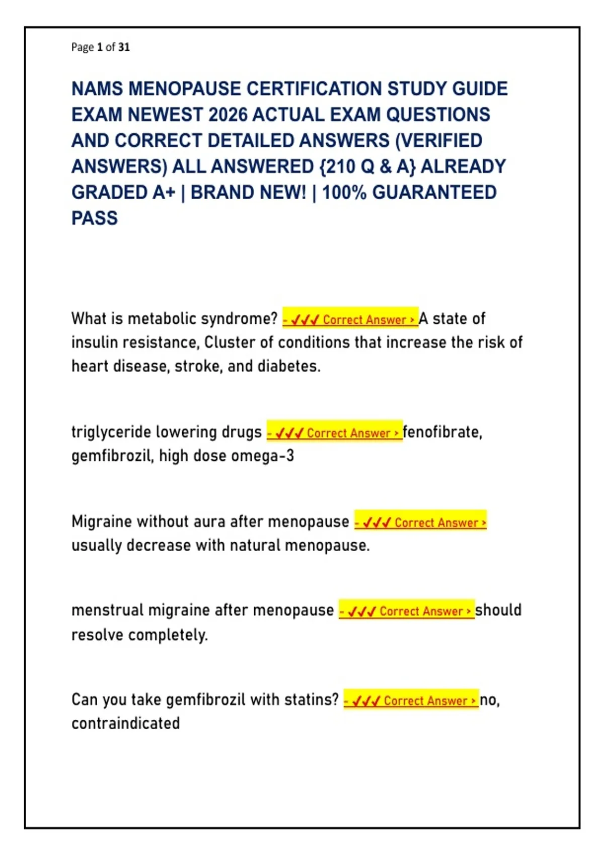 NAMS MENOPAUSE CERTIFICATION STUDY GUIDE EXAM NEWEST 2026 ACTUAL EXAM QUESTIONS AND CORRECT DETAILED ANSWERS (VERIFIED ANSWERS) ALL ANSWERED {210 Q & A} ALREADY GRADED A+ | BRAND NEW! | 100% GUARANTEED PASS