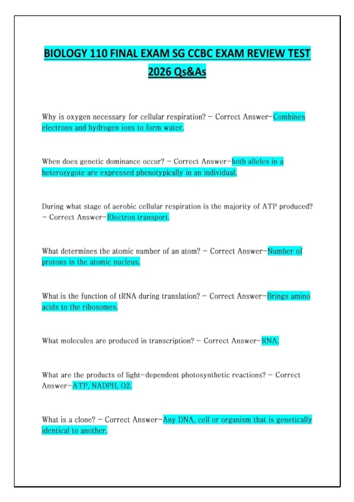 BIOLOGY 110 FINAL EXAM SG CCBC EXAM REVIEW TEST 2026 Qs&As