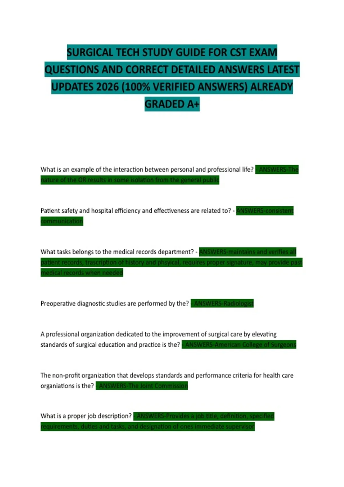 SURGICAL TECH STUDY GUIDE FOR CST EXAM QUESTIONS AND CORRECT DETAILED ANSWERS LATEST UPDATES 2026 (100% VERIFIED ANSWERS) ALREADY GRADED A+