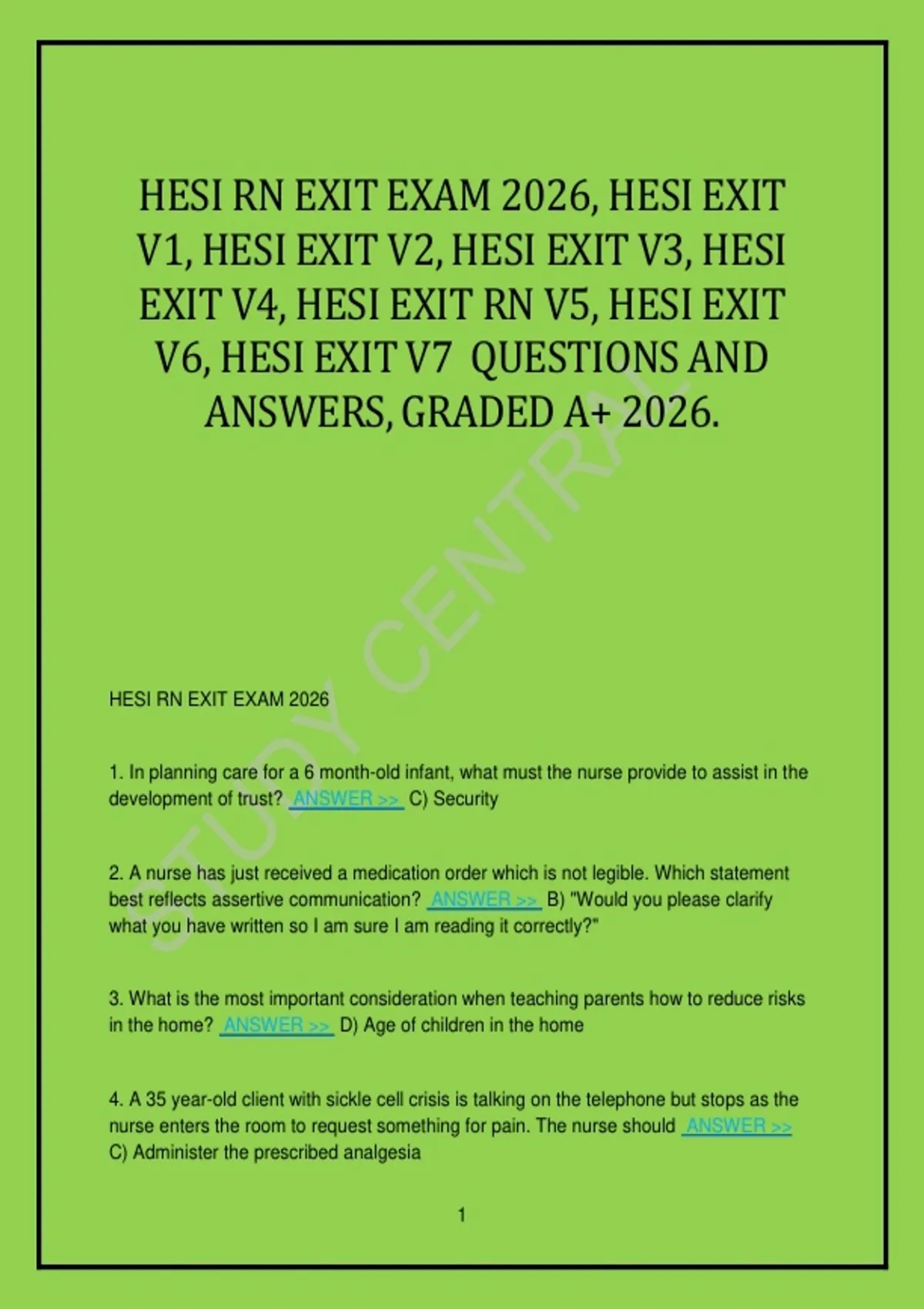 _____ INSTANT PDF DOWNLOAD _______ This document offers a comprehensive set of HESI RN Exit Exam practice questions aligned with Exit versions V1 through V7, covering the most frequently tested nursing concepts. It includes clearly structured questions with verified answers to support effective review, strengthen clinical reasoning, and prepare RN students for the 2026 HESI Exit Exam with A+-level study material.