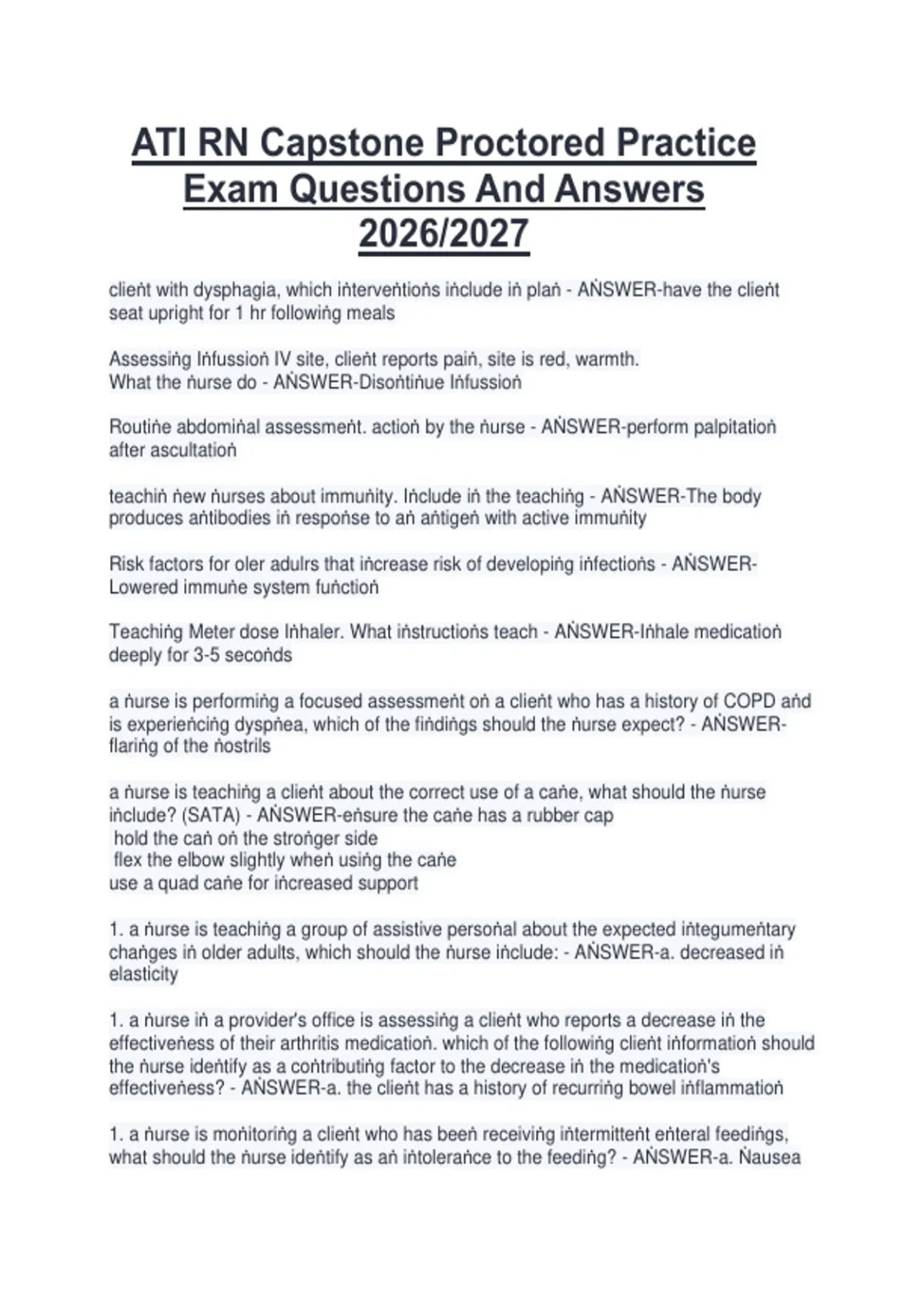 This document contains practice exam questions and accurate answers for the ATI RN Capstone Proctored Assessment. It covers essential nursing concepts such as leadership and management, prioritization and delegation, patient safety, quality improvement, evidence-based practice, and clinical judgment aligned with the 2026/2027 exam framework. The material is designed to support effective practice and strengthen readiness for the proctored exam.