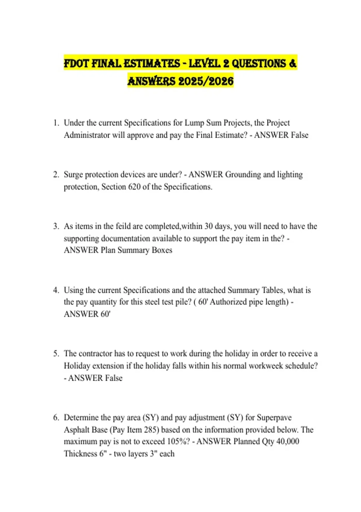 FDOT Final Estimates - Level 2 Questions & answers 2025/2026 1. Under the current Specifications for Lump Sum Projects, the Project Administrator will approve and pay the Final Estimate? - ANSWER False 2. Surge protection devices are under? - ANSWER Grounding and lighting protection, Section 620 of the Specifications. 3. As items in the feild are completed,within 30 days, you will need to have the supporting documentation available to support the pay item in the? - ANSWER Plan Summary Boxes 4. Using the current Specifications and the attached Summary Tables, what is the pay quantity for this steel test pile? ( 60' Authorized pipe length) - ANSWER 60' 5. The contractor has to request to work during the holiday in order to receive a Holiday extension if the holiday falls within his normal workweek schedule? - ANSWER False 6. Determine the pay area (SY) and pay adjustment (SY) for Superpave Asphalt Base (Pay Item 285) based on the information provided below. The maximum pay is not to exceed 105%? - ANSWER Planned Qty 40,000 Thickness 6" - two layers 3" each spread rate 43.3 x 2.540 x 6= 600lbs SY = 300 LBS/SYper layer avg weighted Gmm = 2580 Actual Tonnage = 13607.4 Answer = pay area= 40,595 SY Pay Adjustment +595 SY 7. If a contractor does not request to work during a holiday, he automatically qualifies for Holiday Extension if that holiday falls within a normal workweek schedule? - ANSWER True 8. Which one of the following resources can be used for determining payment for conventional contracts? - ANSWER A)Standard Specifications B) Basis of Estimates Manual C) Construction Project Administration Manual ALL OF THE ABOVE 9. What is the correct way to fill in the Plan Sumary Boxes? - ANSWER A) If no change, use a red check mark, if there are changes, strike through the plan quantity and fill out the final quantity. Earthwork Survey/ Cross Sections Waiver form is used on the following projects? - ANSWER A) Milling and resurfacing projects where shoulder elevation does not change. B) Projects that involve only earthwork around box culvert extensions. C) Projects that involve restoring eroded sections.