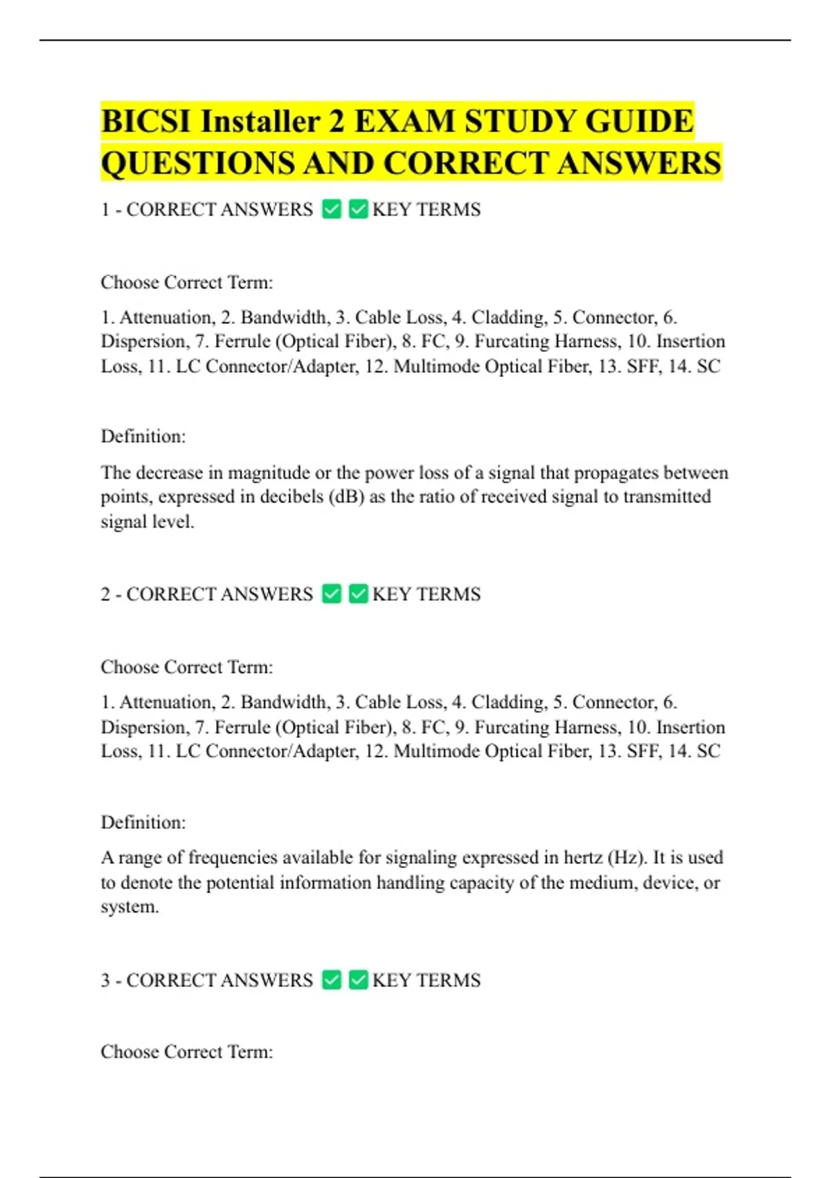 BICSI Installer 2 EXAM STUDY GUIDE QUESTIONS AND CORRECT ANSWERS 1 - CORRECT ANSWERS Choose Correct Term: KEY TERMS 1. Attenuation, 2. Bandwidth, 3. Cable Loss, 4. Cladding, 5. Connector, 6. Dispersion, 7. Ferrule (Optical Fiber), 8. FC, 9. Furcating Harness, 10. Insertion