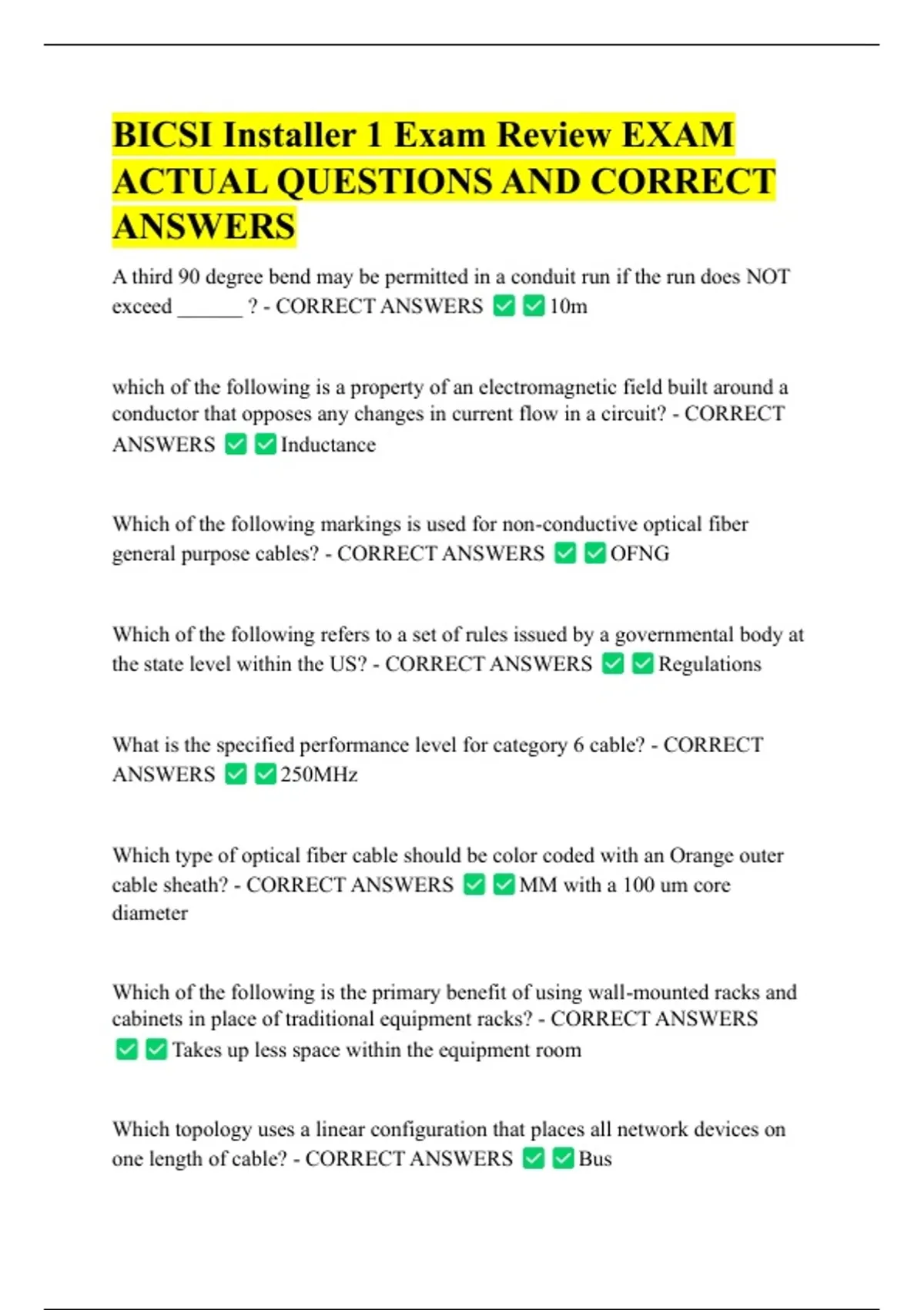 BICSI Installer 1 Exam Review EXAM ACTUAL QUESTIONS AND CORRECT ANSWERS A third 90 degree bend may be permitted in a conduit run if the run does NOT exceed ______ ? - CORRECT ANSWERS 10m which of the following is a property of an electromagnetic field built around a conductor that opposes any changes in current flow in a circuit? - CORRECT