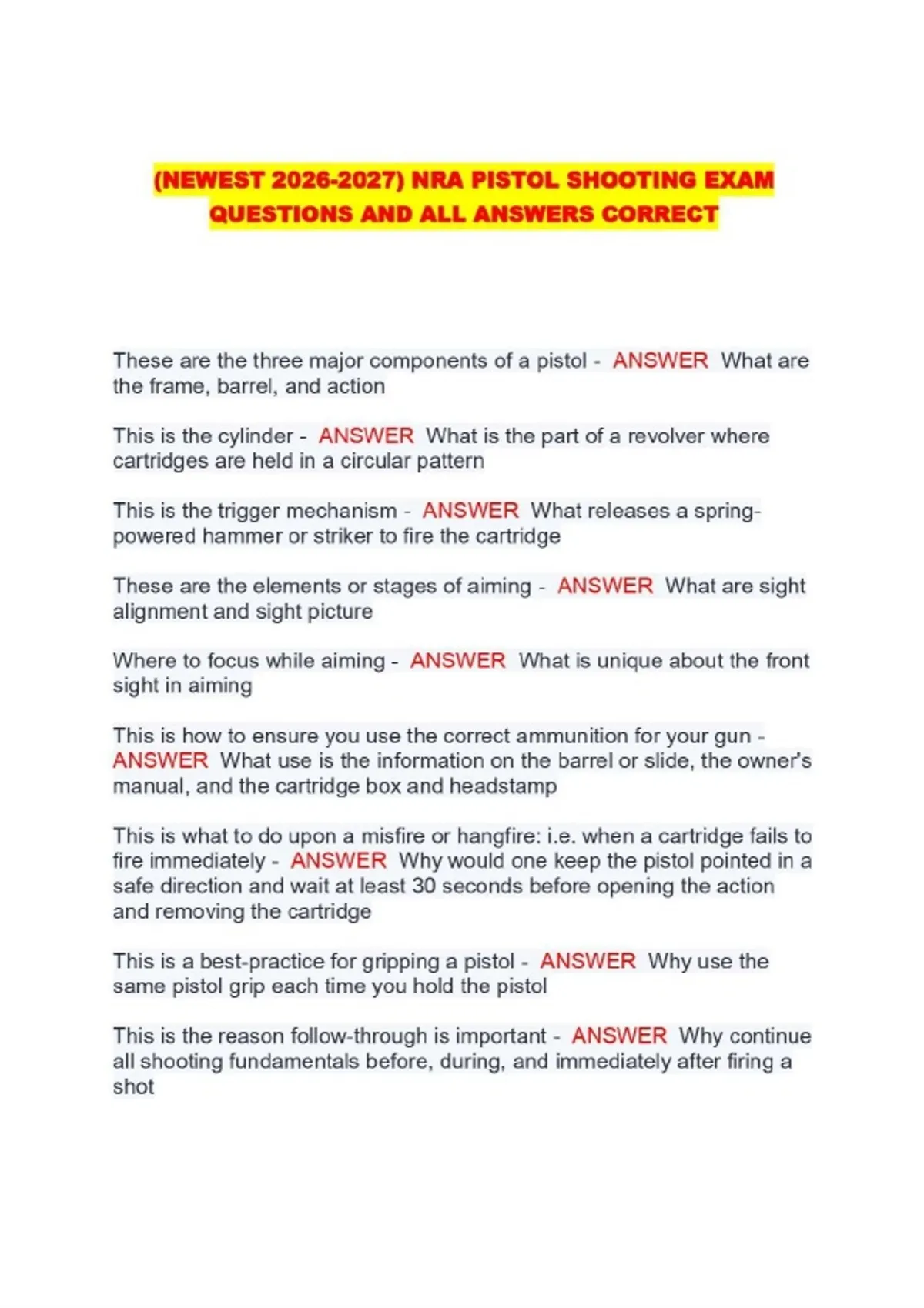 (NEWEST ) NRA PISTOL SHOOTING EXAM QUESTIONS AND ALL ANSWERS CORRECT