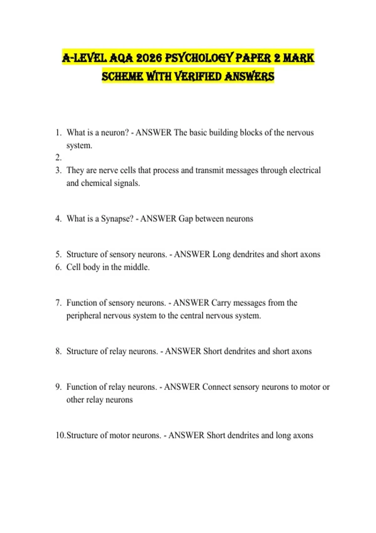 1. What is a neuron? - ANSWER The basic building blocks of the nervous
