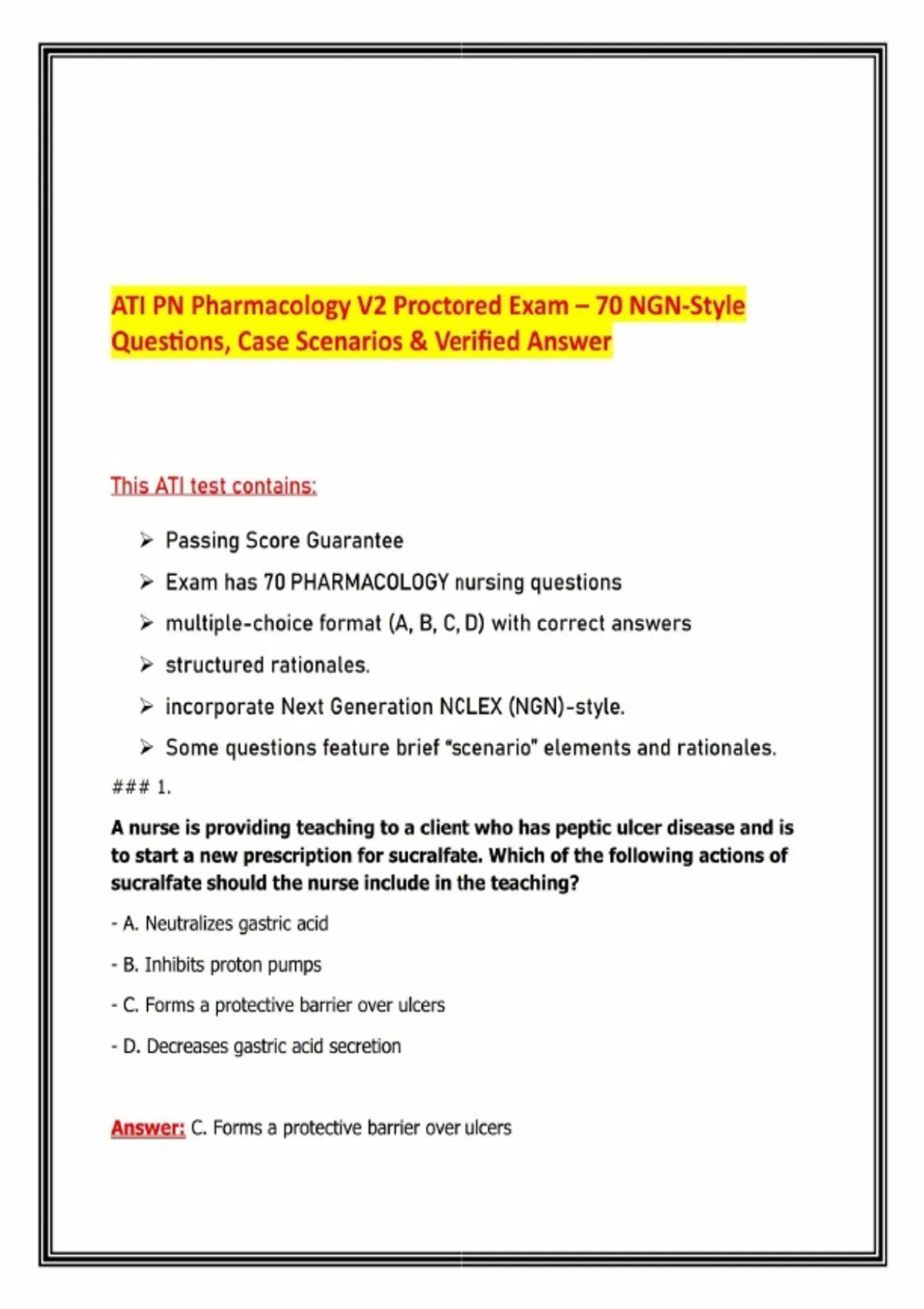 ATI PN Pharmacology V2 Proctored Exam – 70 NGN‑Style Questions, Case Scenarios & Verified AnswerThis ATI PN Pharmacology V2 Proctored Exam Study Resource contains 70 verified NGN‑style questions and answers designed to help practical nursing students prepare for ATI proctored exams and NCLEX‑PN. It incorporates Next Generation NCLEX (NGN) case scenarios with structured rationales to ensure deep understanding and exam success. What’s Inside: - 70 Pharmacology Nursing Questions in multiple‑choice format (A, B, C, D) - Verified Correct Answers with concise rationales - NGN‑Style Case Scenarios to mirror the latest ATI and NCLEX exam formats - High‑yield topics covered: - Sucralfate mechanism of action (protective barrier for ulcers) - Corticosteroid teaching (methylprednisolone monitoring, infection prevention, grapefruit juice interaction) - Safe opioid handling (oral transmucosal fentanyl lozenges storage) - ECG changes in hypokalemia (U‑waves with furosemide therapy) - Opioid adverse effects (constipation prevention with docusate sodium) - Mannitol adverse effects (bibasilar crackles, pulmonary edema risk) - Ranitidine hepatotoxicity (report jaundice) - Anaphylaxis management (epinephrine first‑line for cefazolin reaction) - Beta‑blocker safety (check apical pulse before metoprolol administration) - Pediatric dosage calculations (ciprofloxacin mg/kg conversions) - Benzodiazepine overdose reversal (flumazenil for diazepam toxicity) Key Benefits: - Structured rationales explain why each answer is correct - Incorporates NGN‑style case scenarios for realistic practice - Designed to help PN students achieve a Level 2 or higher on ATI Pharmacology exams - Perfect for ATI prep, NCLEX‑PN review, and nursing school succes