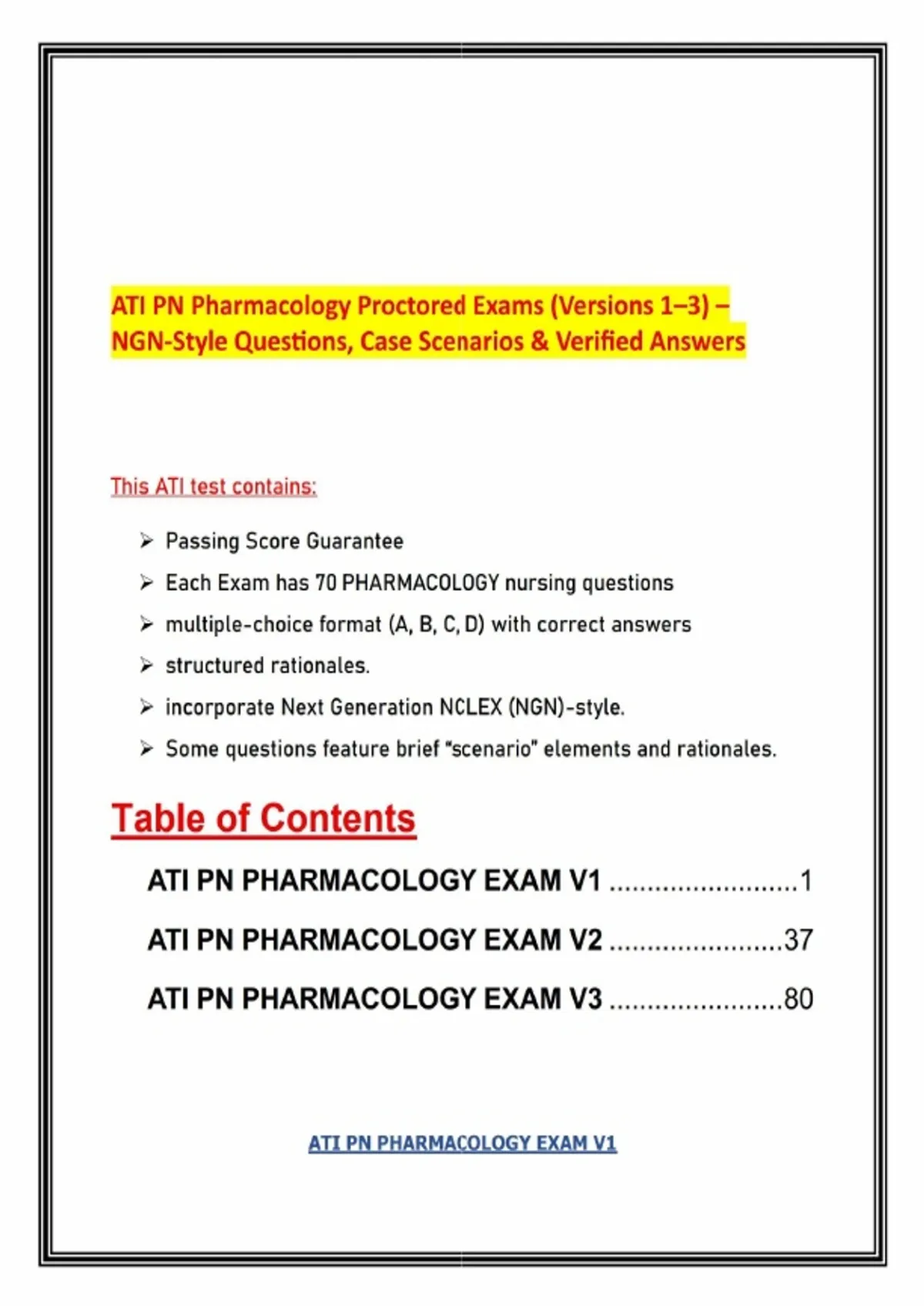 ATI PN Pharmacology Proctored Exams (Versions 1–3) – NGN Style Questions, Case Scenarios & Verified AnswersThis ATI PN Pharmacology Exam Pack includes three complete versions (V1, V2, V3) of the ATI PN Pharmacology Proctored Exam. Each exam contains 70 verified NGN‑style questions and answers with structured rationales, designed to help practical nursing students prepare for ATI proctored exams and NCLEX‑PN. What’s Inside: - Exam V1 – Core pharmacology topics including omeprazole administration, aspirin contraindications in pediatrics, penicillin G benzathine IM safety, newborn hepatitis B immunization, cocaine intoxication signs, IV drip rate calculations, alendronate teaching, hydrochlorothiazide adverse effects, hydromorphone disposal, metoprolol contraindications, disulfiram reactions, and pregnancy‑safe vaccines. - Exam V2 – Expanded pharmacology practice covering sucralfate mechanism, corticosteroid teaching (methylprednisolone), opioid safety (fentanyl lozenges), furosemide hypokalemia ECG changes, constipation prevention with stool softeners, mannitol adverse effects, ranitidine hepatotoxicity, anaphylaxis management, metoprolol pulse checks, pediatric dosage calculations, and benzodiazepine overdose reversal. - Exam V3 – Advanced pharmacology scenarios including NG tube medication administration, lithium toxicity monitoring, spironolactone + lisinopril hyperkalemia risk, rectal acetaminophen technique, furosemide potassium monitoring, valproic acid hepatotoxicity, ondansetron for postoperative nausea, insulin regimen teaching, ear drop administration, alendronate upright positioning, diazepam withdrawal, and infant immunization technique. - Pass Guarantee – Designed to help PN students achieve a Level 2 or higher on ATI Pharmacology exams. Key Benefits: - Covers all ATI PN Pharmacology domains across three versions - Provides realistic NGN‑style practice for NCLEX‑PN readiness - Includes expert rationales explaining why each answer is correct - Perfect for ATI prep, NCLEX‑PN review, and nursing school succes