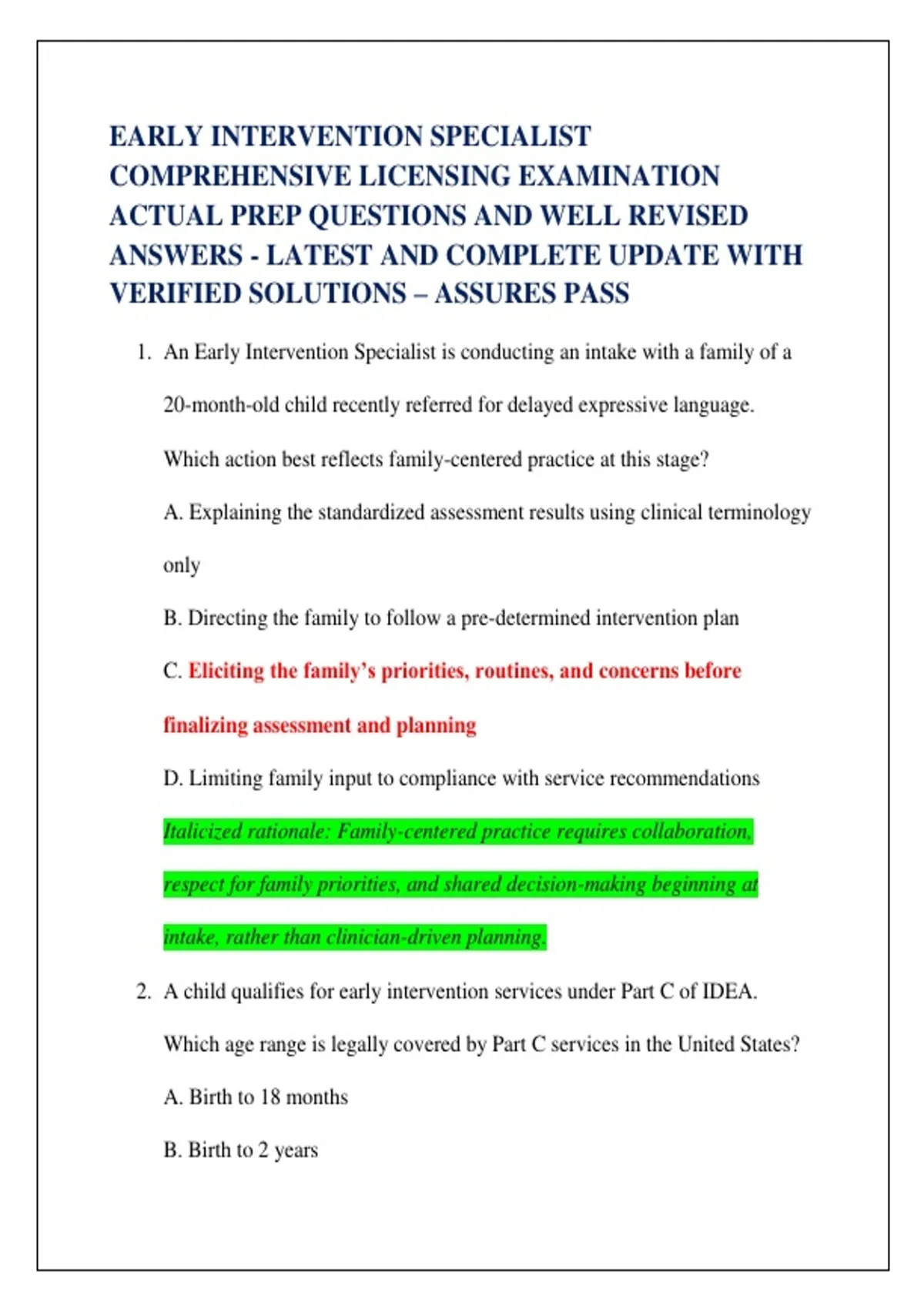 1. An Early Intervention Specialist is conducting an intake with a family of a