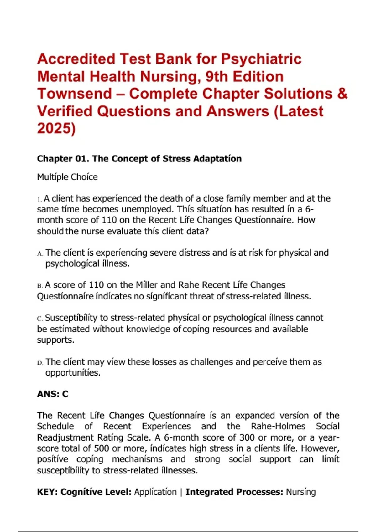Access the complete test bank for Psychiatric Mental Health Nursing, 9th Edition by Townsend. Includes verified 2025 questions and full chapter solutions to support study, revision and a solid understanding of psychiatric mental health nursing concepts.