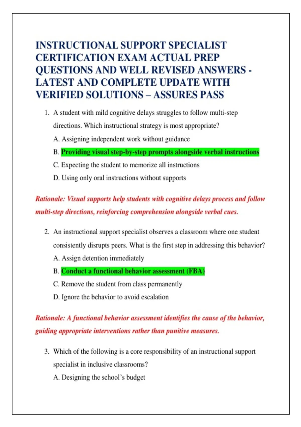 INSTRUCTIONAL SUPPORT SPECIALIST CERTIFICATION EXAM ACTUAL PREP QUESTIONS AND WELL REVISED ANSWERS - LATEST AND COMPLETE UPDATE WITH VERIFIED SOLUTIONS – ASSURES PASS