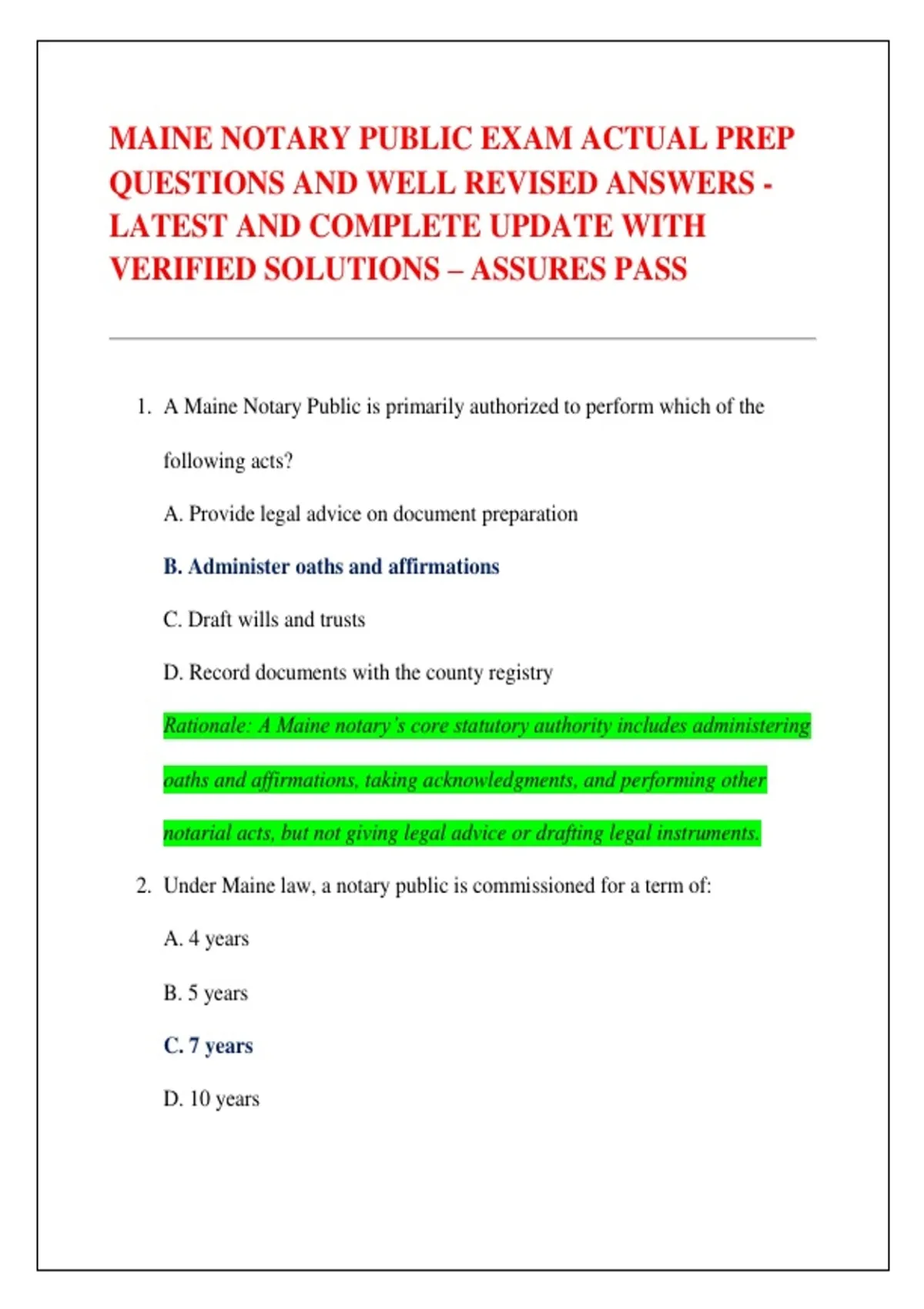 MAINE NOTARY PUBLIC EXAM ACTUAL PREP QUESTIONS AND WELL REVISED ANSWERS - LATEST AND COMPLETE UPDATE WITH VERIFIED SOLUTIONS – ASSURES PASS