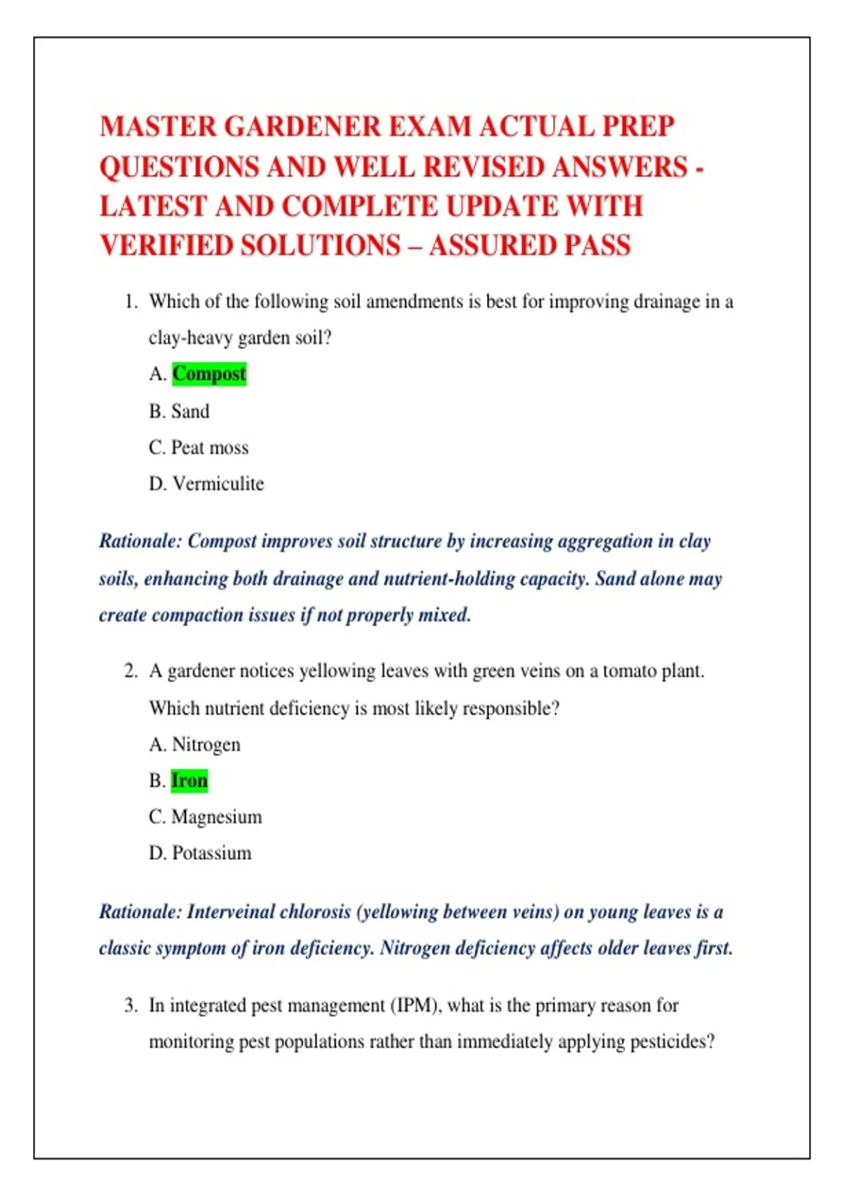 MASTER GARDENER EXAM ACTUAL PREP QUESTIONS AND WELL REVISED ANSWERS - LATEST AND COMPLETE UPDATE WITH VERIFIED SOLUTIONS – ASSURED PASS