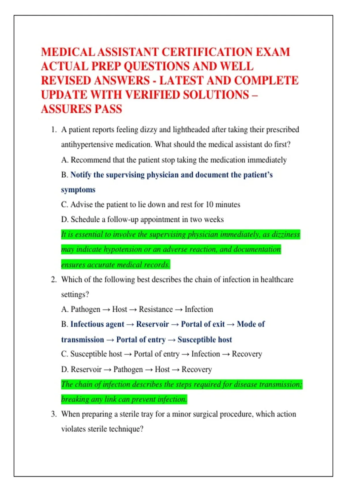 MEDICAL ASSISTANT CERTIFICATION EXAM ACTUAL PREP QUESTIONS AND WELL REVISED ANSWERS - LATEST AND COMPLETE UPDATE WITH VERIFIED SOLUTIONS – ASSURES PASS
