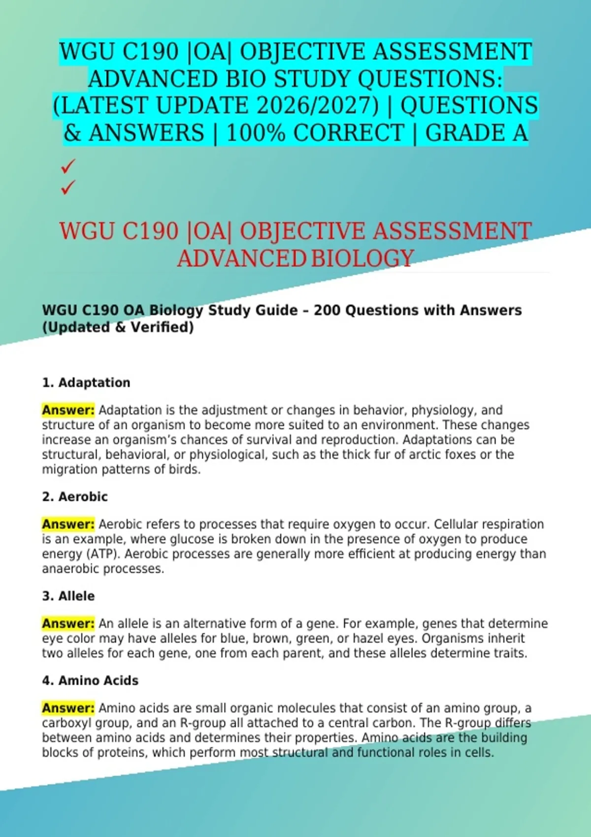 WGU C190 |OA| OBJECTIVE ASSESSMENT ADVANCED BIO STUDY QUESTIONS: (LATEST UPDATE 2026/2027) | QUESTIONS & ANSWERS | 100% CORRECT | GRADE A
