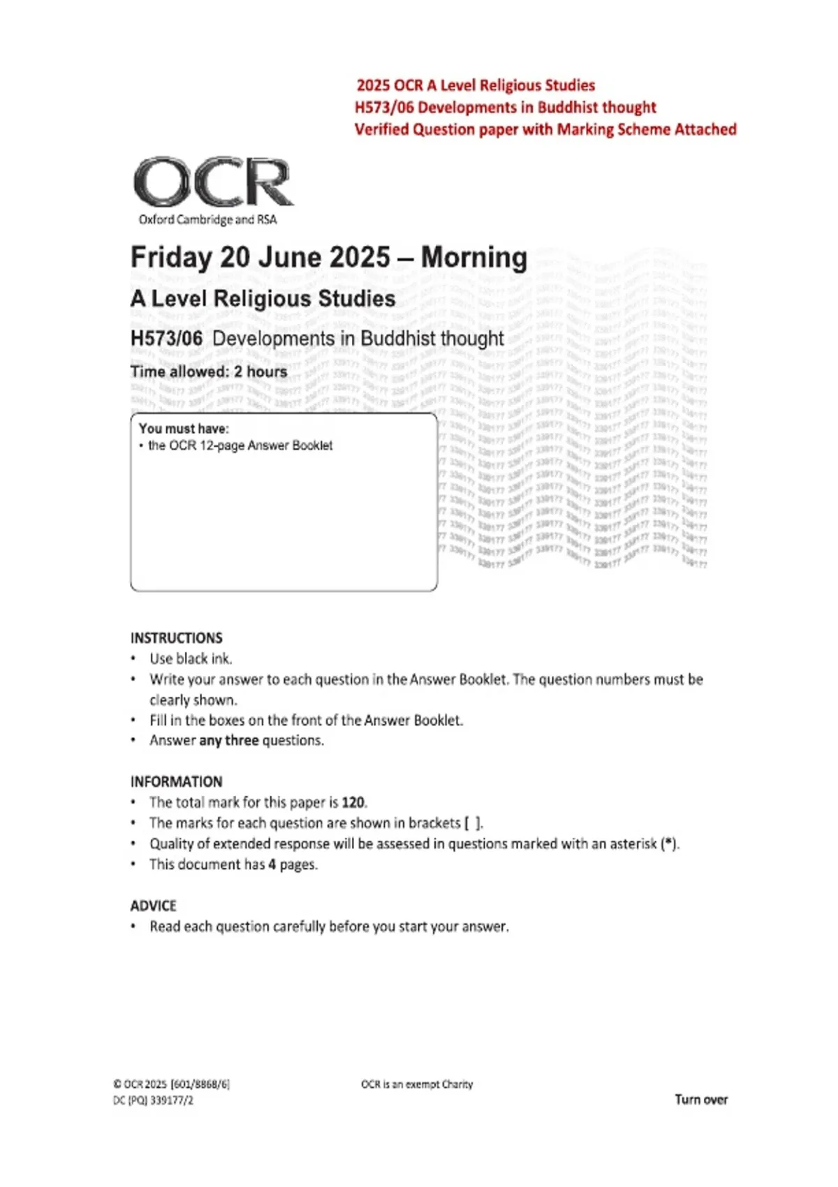 Prepared for the 2025 OCR examination series, this OCR A Level Religious Studies H573/06 Developments in Buddhist Thought paper is presented in real exam format with the complete question paper and marking scheme attached. Ideal for mock exams, timed practice, and focused revision, it reflects authentic OCR assessment objectives and extended evaluative essay requirements.