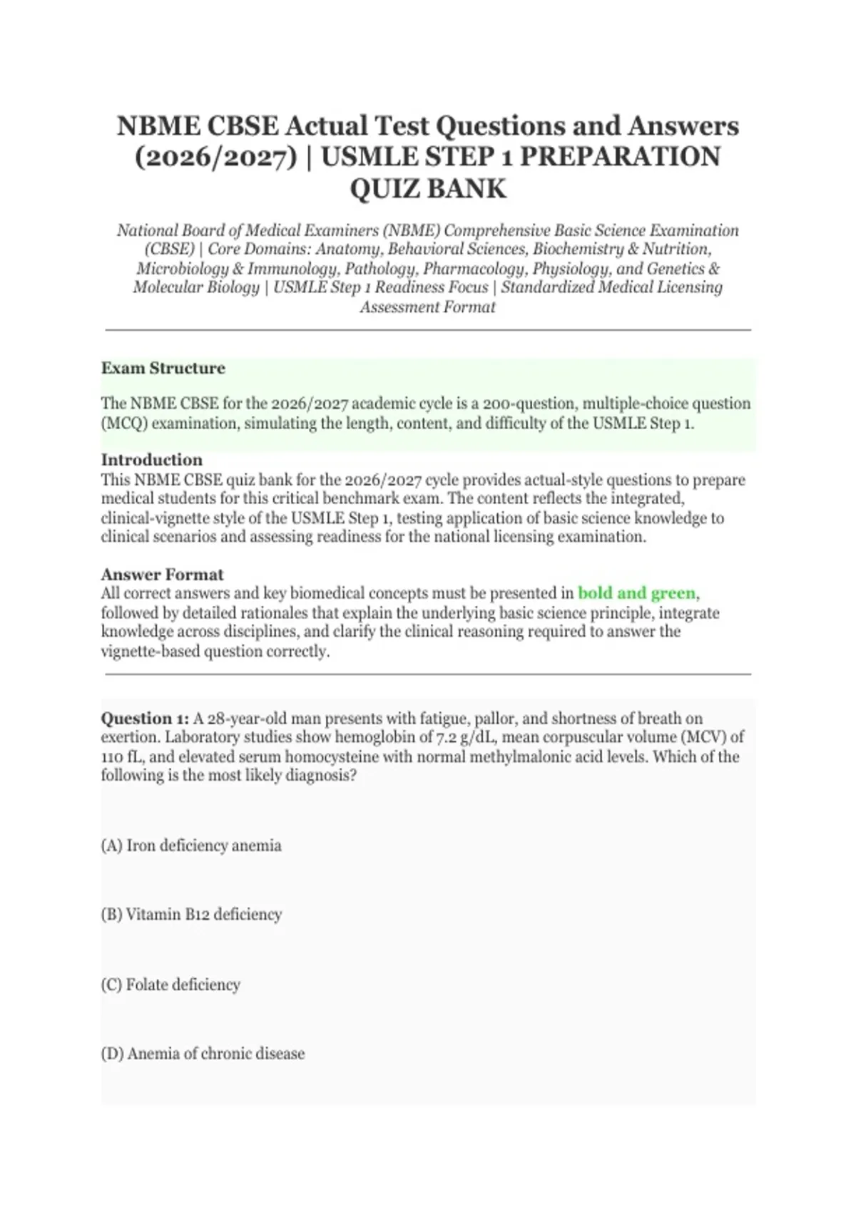 NBME CBSE Actual Test Questions and Answers 2026/2027 | USMLE Step 1 Preparation Quiz Bank | National Board of Medical Examiners Comprehensive Basic Science Exam