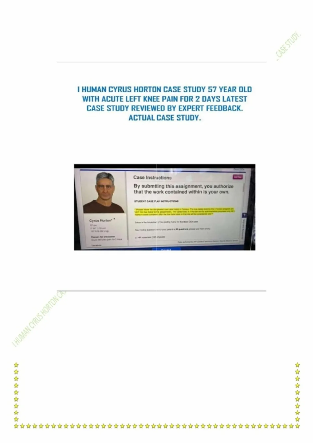 I HUMAN CYRUS HORTON CASE STUDY 57 YEAR OLD WITH ACUTE LEFT KNEE PAIN FOR 2 DAYS LATEST CASE STUDY REVIEWED BY EXPERT FEEDBACK. ACTUAL CASE STUDY..