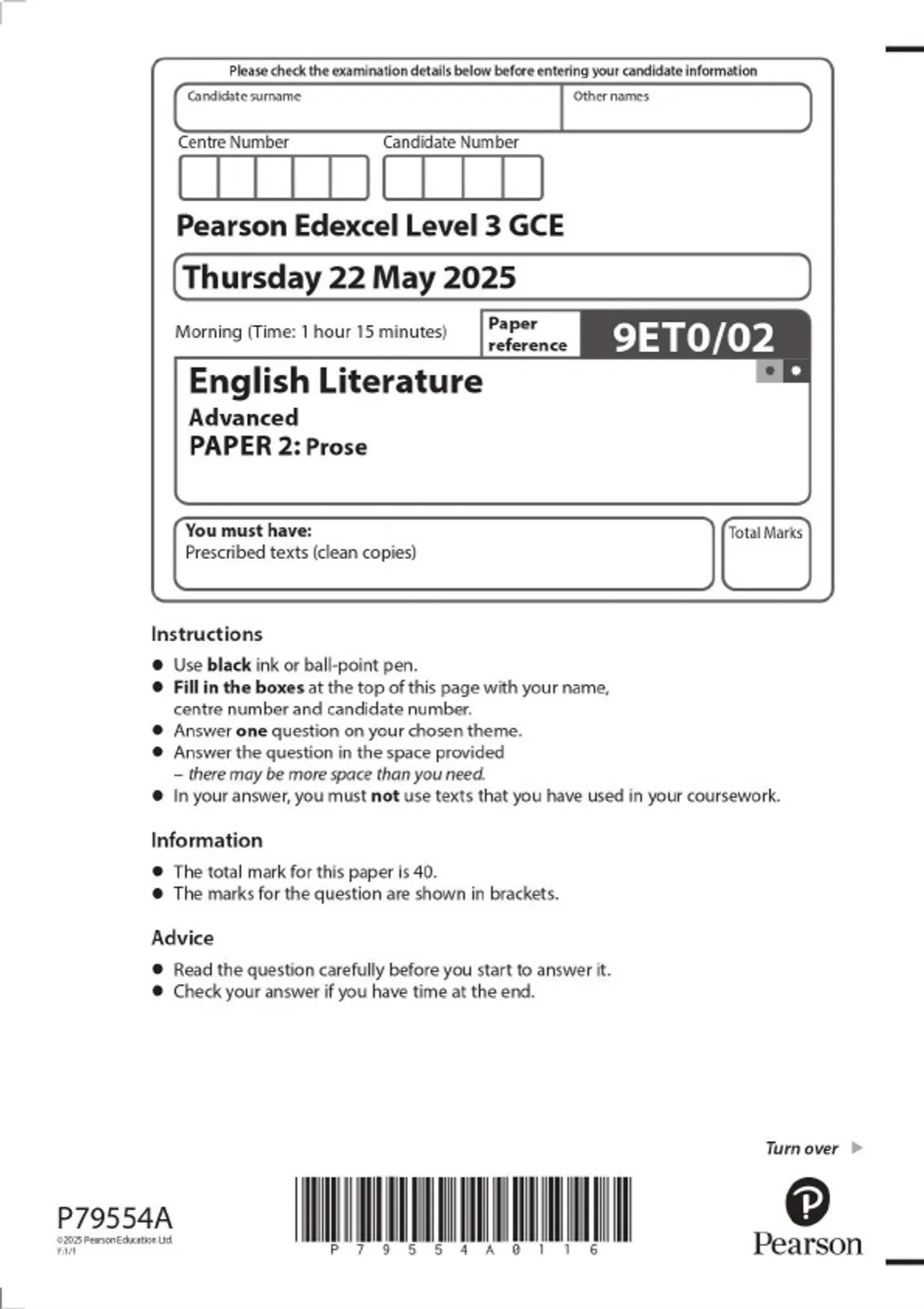 2025 Pearson Edexcel Level 3 GCE 9ET0 English Literature Advanced QUESTION PAPERS & MARKSCHEMES