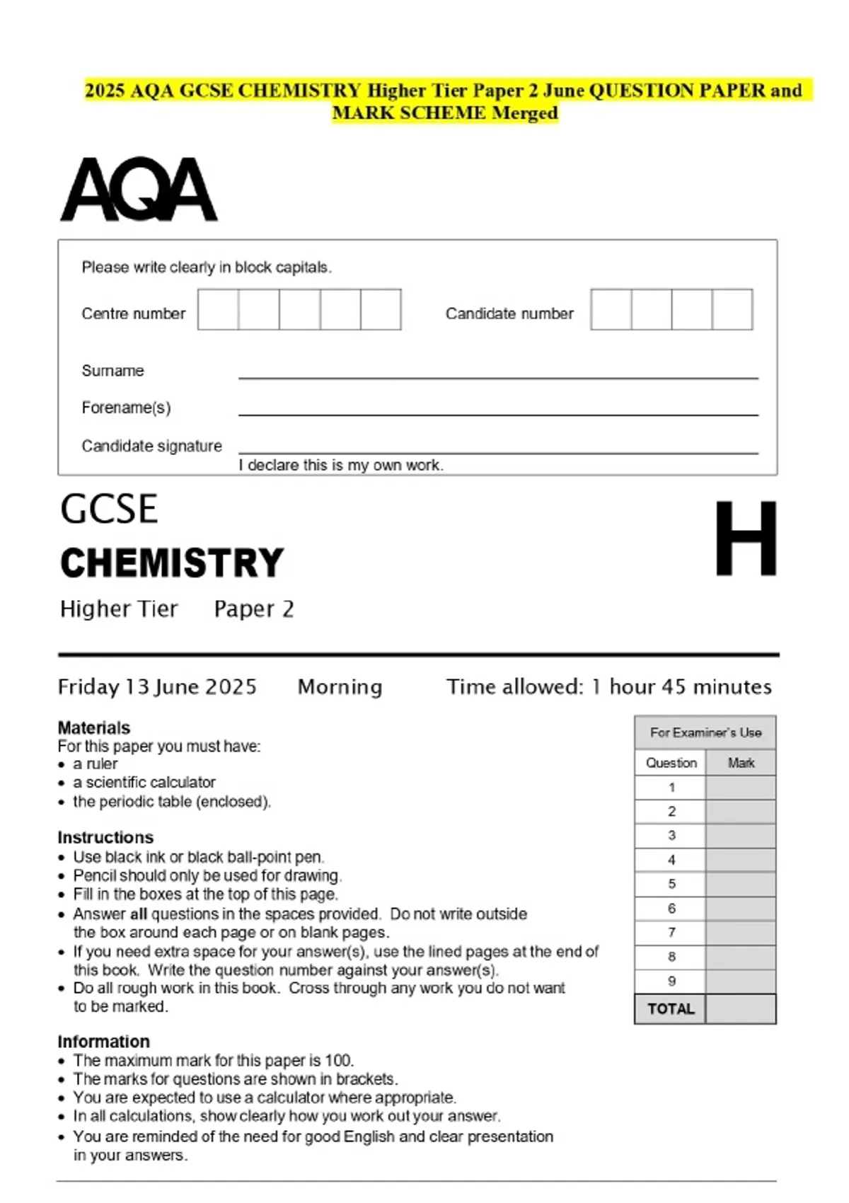 2025 AQA GCSE CHEMISTRY Higher Tier Paper 2 June QUESTION PAPER and MARK SCHEME Merged