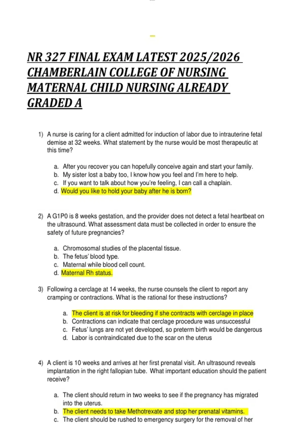 1) A nurse is caring for a client admitted for induction of labor due to intrauterine fetal