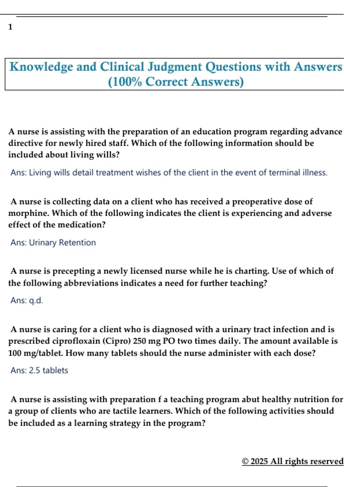 The Knowledge and Clinical Judgment Questions resource provides nursing students with a comprehensive set of practice questions and answers to enhance critical thinking and clinical decision-making skills. This updated 2026/2027 version covers patient assessment, care planning, prioritization, and evidence-based interventions. The material supports exam preparation, reinforces clinical judgment concepts, and helps learners improve performance in coursework, assessments, and practical nursing scenarios.