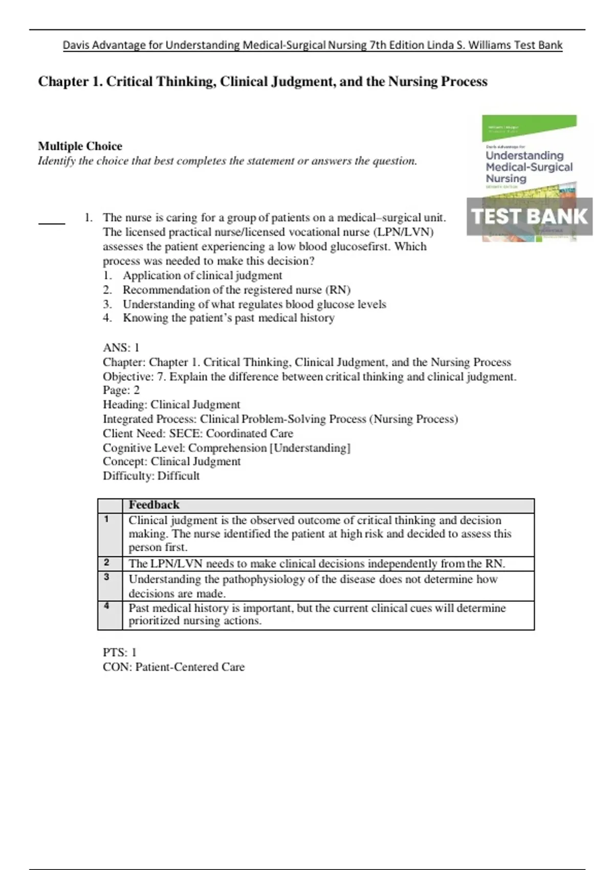 , Davis Advantage for Understanding Medical-Surgical Nursing 7th Edition Linda S. Williams Test Bank
