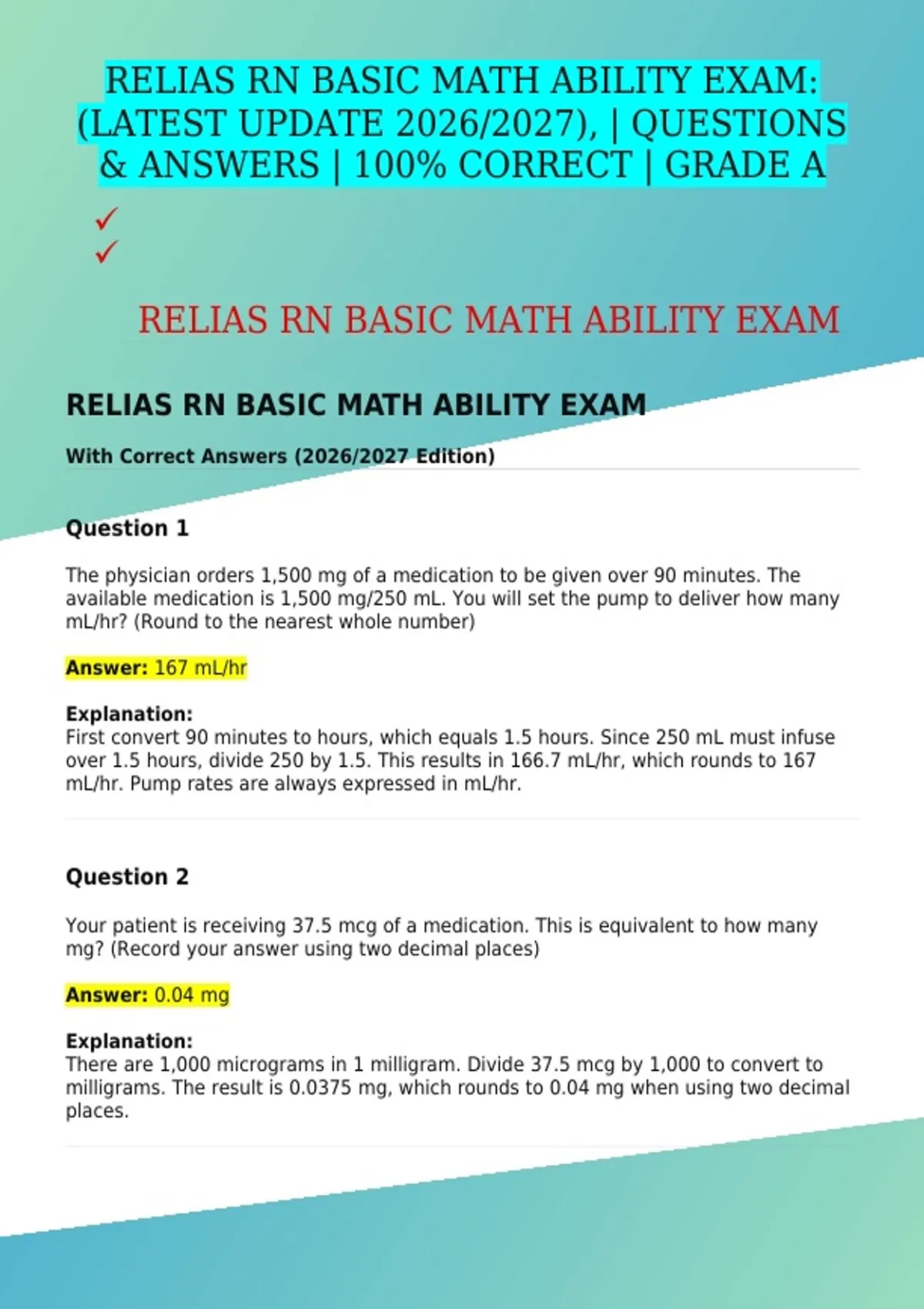 RELIAS RN BASIC MATH ABILITY EXAM: (LATEST UPDATE 2026/2027), | QUESTIONS & ANSWERS | 100% CORRECT | GRADE A