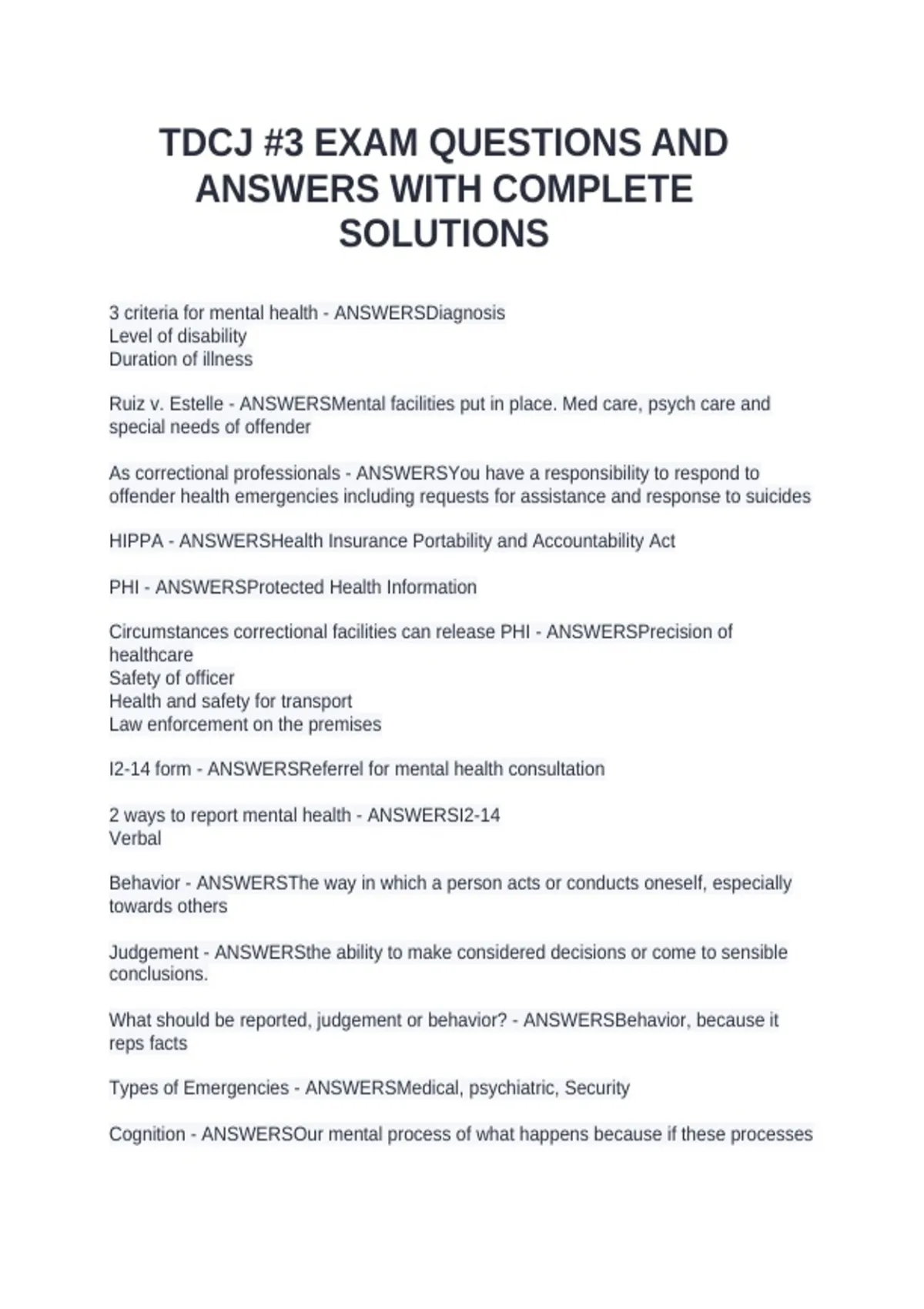3 criteria for mental health - ANSWERSDiagnosis Level of disability Duration of illness Ruiz v. Estelle - ANSWERSMental facilities put in place. Med care, psych care and special needs of offender As correctional professionals - ANSWERSYou have a responsibility to respond to offender health emergencies including requests for assistance and response to suicides HIPPA - ANSWERSHealth Insurance Portability and Accountability Act PHI - ANSWERSProtected Health Information Circumstances correctional facilities can release PHI - ANSWERSPrecision of healthcare Safety of officer Health and safety for transport Law enforcement on the premises I2-14 form - ANSWERSReferrel for mental health consultation 2 ways to report mental health - ANSWERSI2-14 Verbal Behavior - ANSWERSThe way in which a person acts or conducts oneself, especially towards others Judgement - ANSWERSthe ability to make considered decisions or come to sensible conclusions.