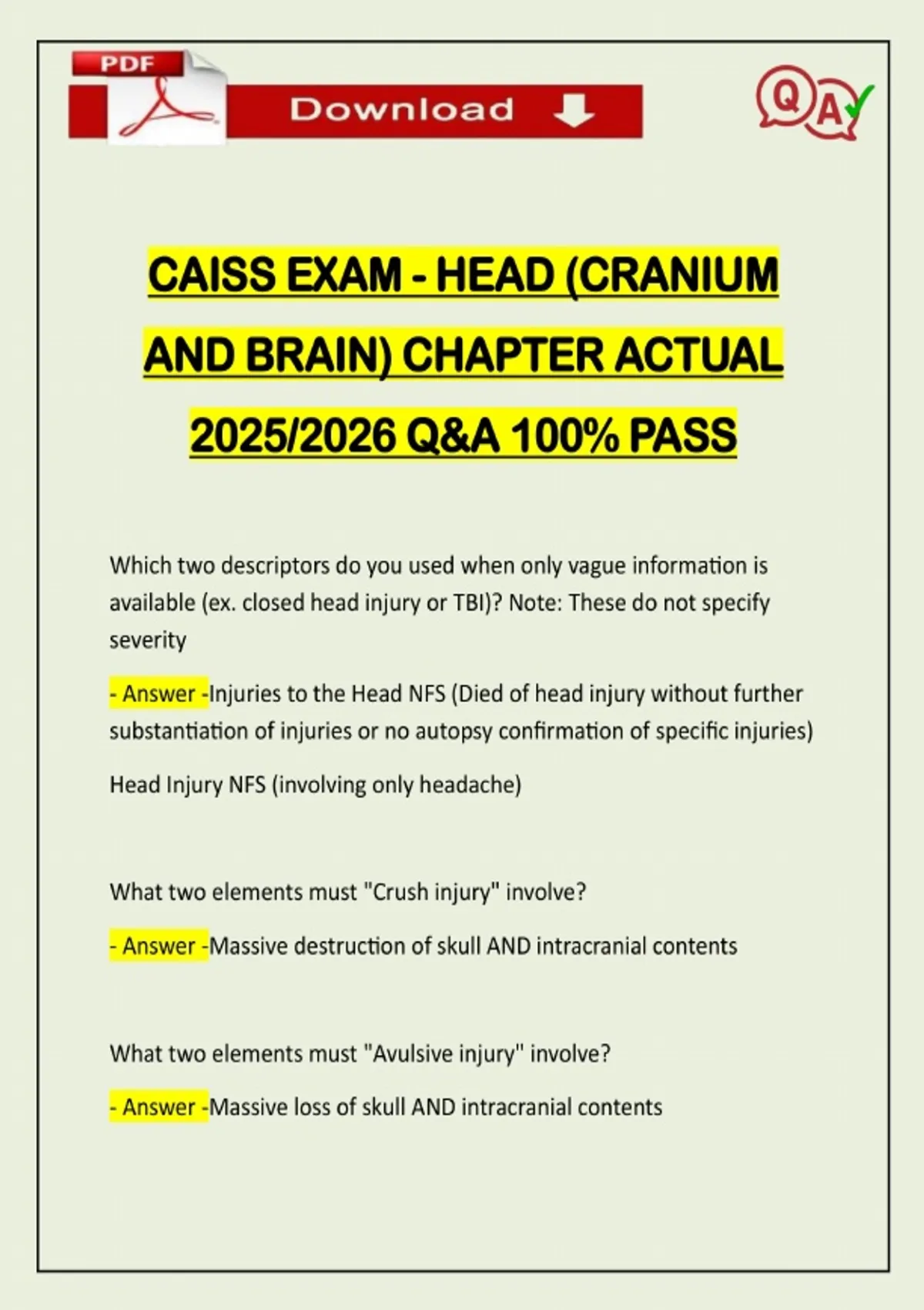 CAISS EXAM - HEAD (CRANIUM AND BRAIN) CHAPTER ACTUAL 2025/2026 Q&A 100% PASS Which two descriptors do you used when only vague information is available (ex. closed head injury or TBI)? Note: These do not specify severity - Answer -Injuries to the Head NFS (Died of head injury without further substantiation of injuries or no autopsy confirmation of specific injuries) Head Injury NFS (involving only headache) What two elements must "Crush injury" involve? - Answer -Massive destruction of skull AND intracranial contents What two elements must "Avulsive injury" involve? - Answer -Massive loss of skull AND intracranial contentsNeed assistance on Online classes, Exams & Assignments? Reach out for instant help!! Full Course Assistance, Plagiarism-free Essay Writing, Research Paper, Dissertation, Discussion Posts, etc…. Confidential & Secure services. Tutors are available for all subjects! Email now at: Where to code a penetrating injury to if site is known? - Answer -The specific anatomical site (example - brain stem, cerebellum or cerebrum) Where to code a penetrating injury to if site is not known or more than one site is injured? - Answer -If the skull is not penetrated, code as scalp laceration Code as a single GSW with both entry and exit wounds as one injury Do soft tissue injuries get assigned