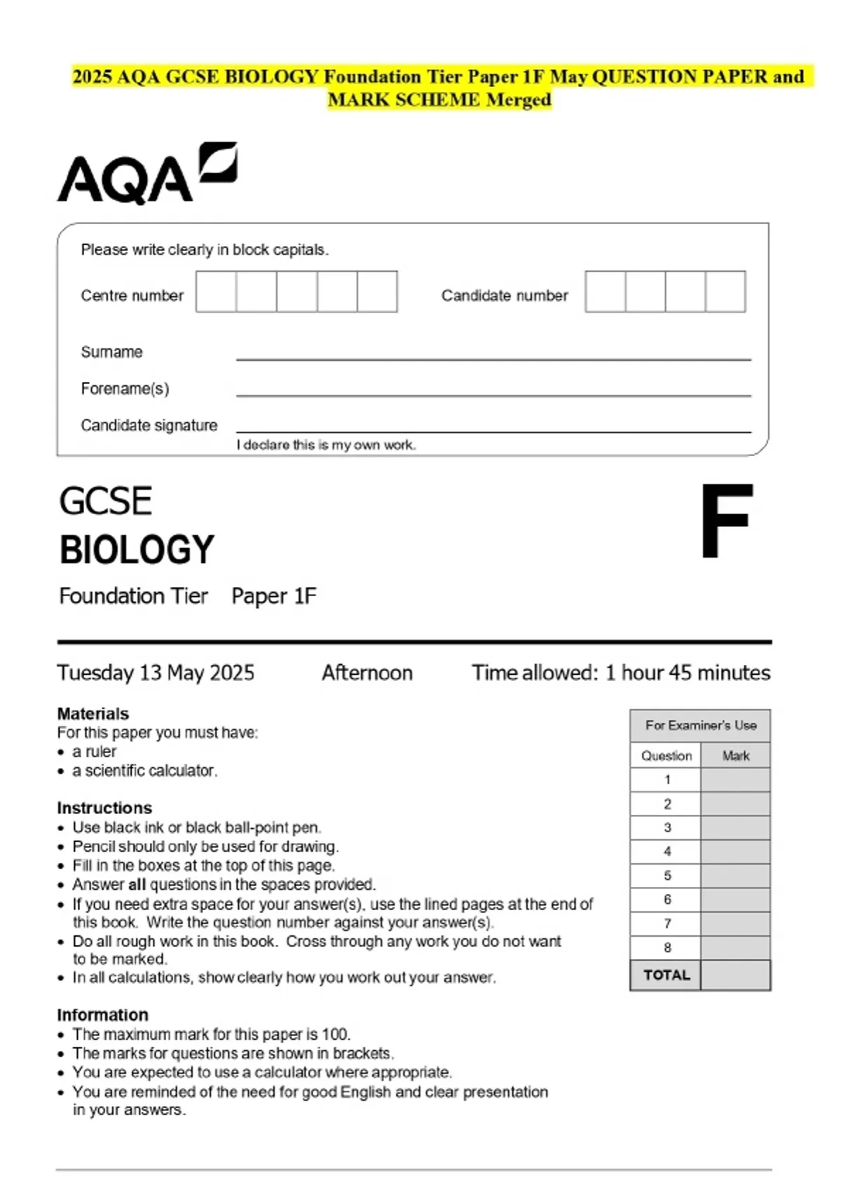 2025 AQA GCSE BIOLOGY Foundation Tier Paper 1F May QUESTION PAPER and MARK SCHEME Merged
