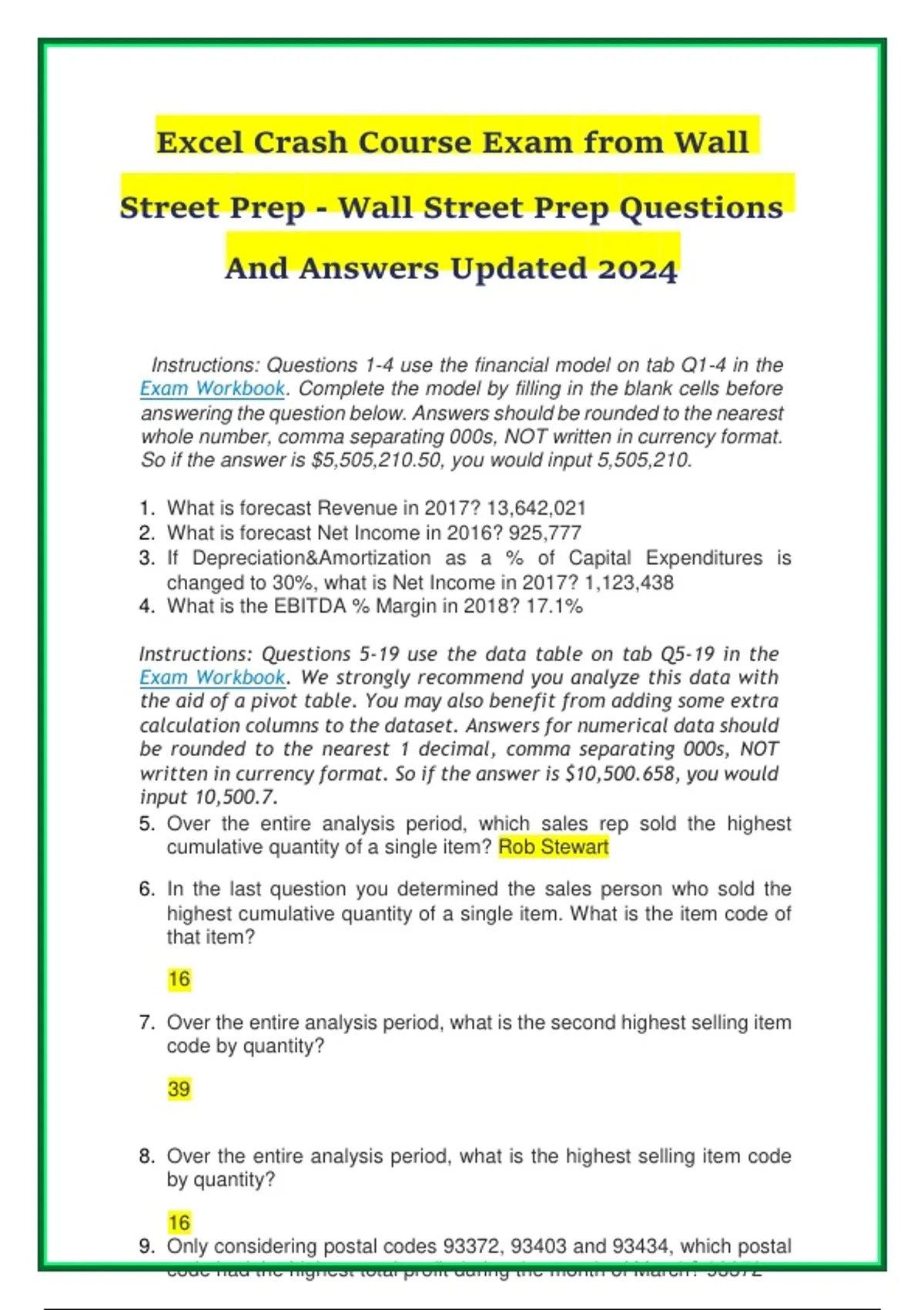 The Excel Crash Course Exam from Wall Street Prep provides finance students and professionals with a comprehensive set of practice questions and answers to master Excel for financial modeling and analysis. This updated 2026/2027 version covers formulas, functions, data analysis, financial modeling techniques, and spreadsheet best practices. The material supports exam preparation, reinforces core Excel skills, and helps learners improve efficiency, accuracy, and performance in finance coursework, professional tasks, and Wall Street Prep assessments.