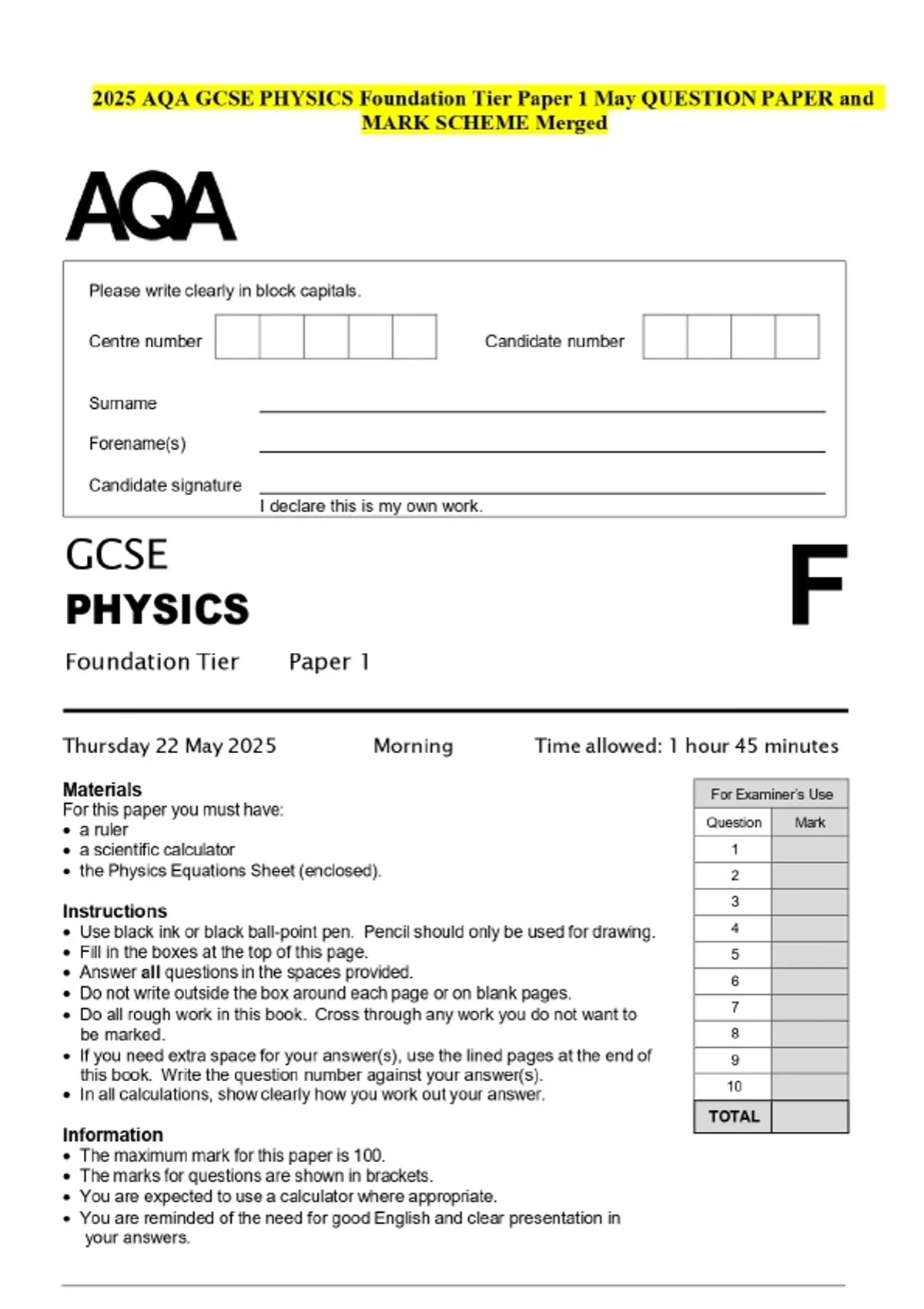 2025 AQA GCSE PHYSICS Foundation Tier Paper 1 May QUESTION PAPER and MARK SCHEME Merged