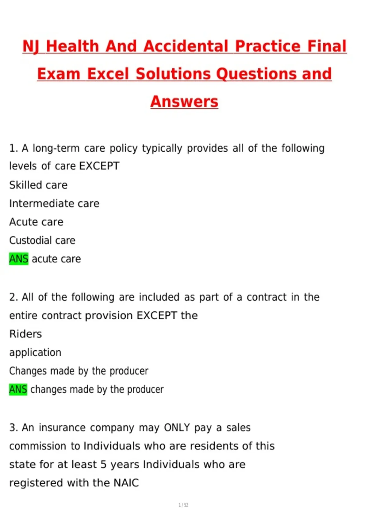 NJ Health and Accidental Practice Final Exam 2026 | Questions with 100% Correct Answers Complete | Updated 2026 / 2027 Verified by Experts A+ GRADE NJ Accident and Health Producer Exam Prep 2026 includes realistic practice exams, actual exam-style questions, and verified correct answers aligned with the New Jersey Accident & Health Insurance Producer Exam. Covers NJ Health and Accident insurance concepts, state laws, rules and regulations, ethics, policies, benefits, underwriting, claims, and compliance, plus final exam review and exam-simulator style questions. Ideal for first-time test takers and retakes seeking confident, efficient preparation. Instant PDF download for immediate access. NJ life and health exam questions 2025 with verified answers. Latest New Jersey property and casualty final exam practice test 2025. Updated NJ state insurance exam study guide for 2025/2026. New Jersey health insurance producer license exam prep materials 2025. NJ accident and health insurance laws and regulations study guide 2025. Primerica life insurance exam practice questions for New Jersey 2025. NJ property producer license exam simulator with 2025 updates. New Jersey PSI insurance practice exam with latest 2025 questions. NJ life and health final exam study materials for A+ grade 2025. Latest NJ accident and health producer practice exams for 2025/2026. New Jersey insurance laws and rules common to life and health 2025 review. NJ insurance exam prep course with verified answers for 2025. Updated New Jersey life insurance exam questions and answers 2025. NJ property and casualty insurance exam study guide with 2025 updates. New Jersey health insurance final exam practice test with latest questions. NJ accident and health producer exam tips and tricks for 2025. Latest New Jersey insurance laws and regulations study materials 2025. NJ Primerica life insurance exam preparation course for 2025/2026. New Jersey property producer license exam flashcards updated for 2025. NJ PSI insurance practice exam with 2025 verified answers. Latest New Jersey life and health insurance exam simulator for 2025. NJ accident and health producer exam study plan for A+ grade 2025. New Jersey insurance exam question bank with 2025/2026 updates. NJ life and health insurance final exam review course for 2025. Latest New Jersey property and casualty insurance practice test 2026