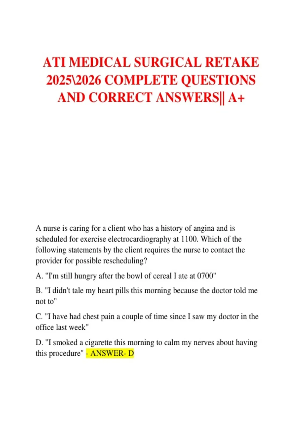 ATI MEDICAL SURGICAL RETAKE COMPLETE QUESTIONS AND CORRECT ANSWERS|| A+ATI MEDICAL SURGICAL RETAKE COMPLETE QUESTIONS AND CORRECT ANSWERS|| A+ATI MEDICAL SURGICAL RETAKE COMPLETE QUESTIONS AND CORRECT ANSWERS|| A+