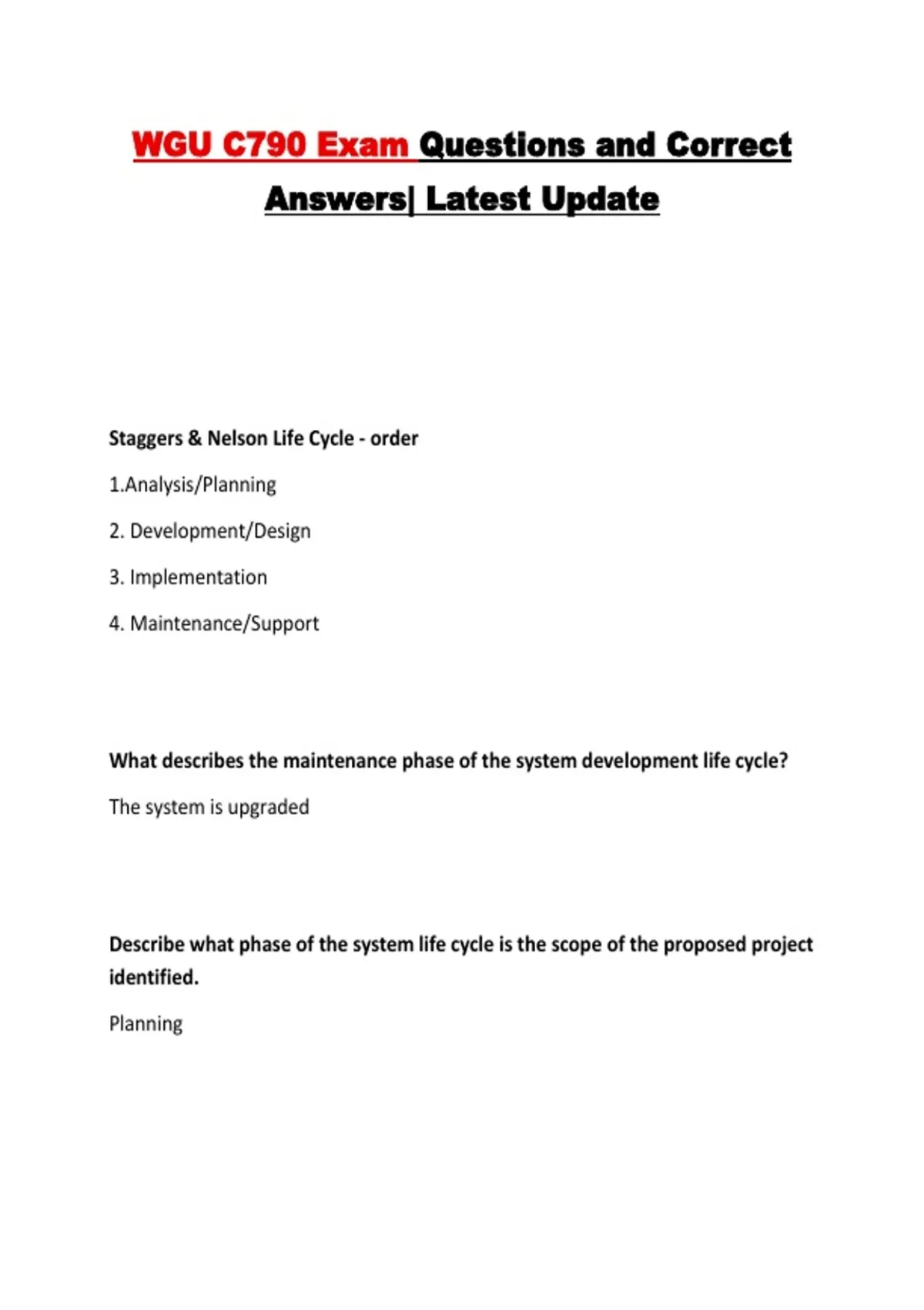 This document contains updated exam questions and verified correct answers for the WGU Nursing Informatics C790 course. It covers key topics including system development life cycle models, clinical decision support, standardized terminologies, project management, EHR implementation, patient safety, evidence-based practice, and healthcare data management. The material is designed to support exam preparation and reinforce understanding of core nursing informatics concepts.