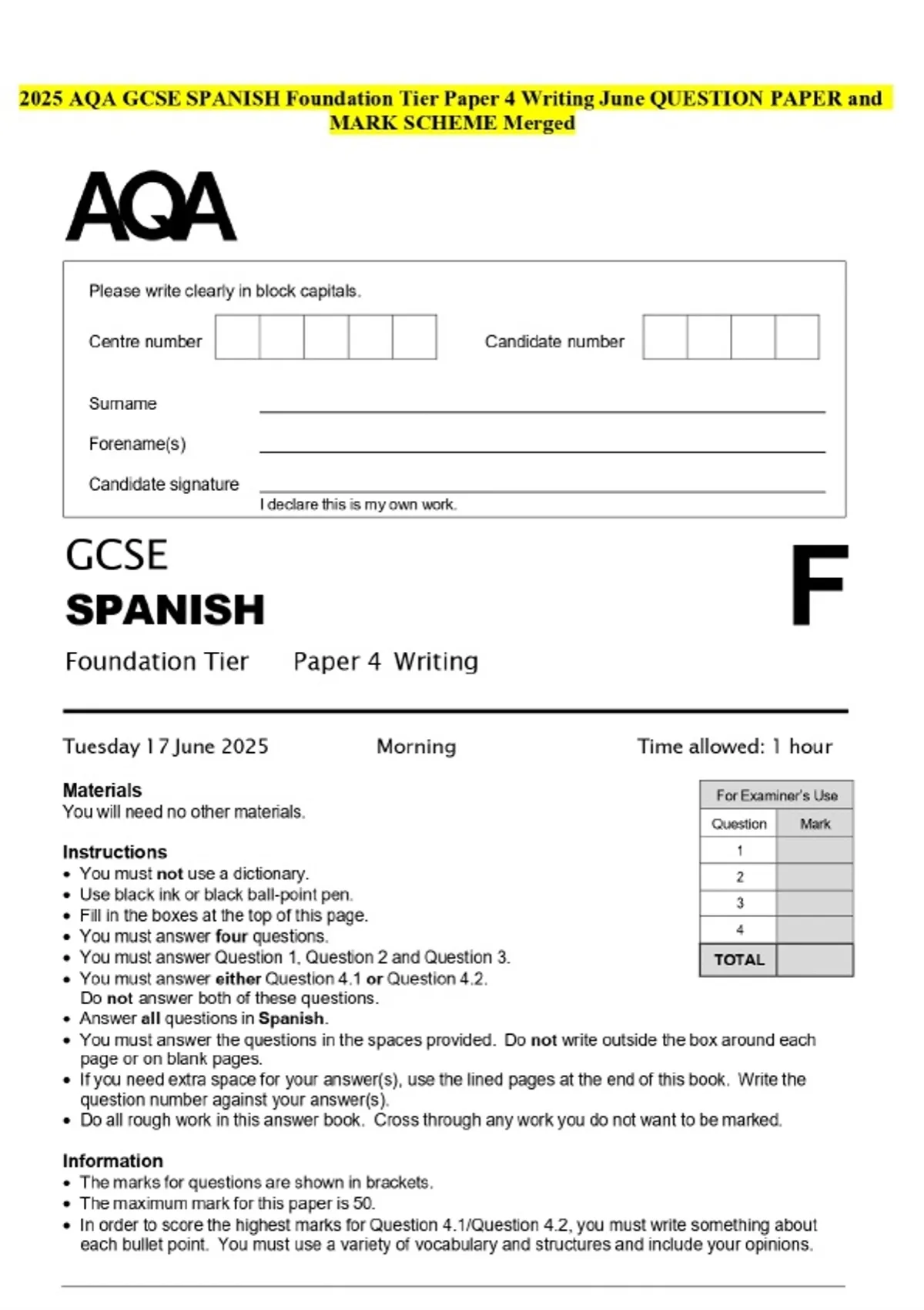 2025 AQA GCSE SPANISH Foundation Tier Paper 4 Writing June QUESTION PAPER and MARK SCHEME Merged