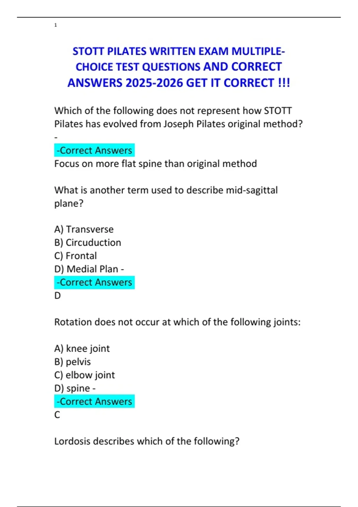 STOTT PILATES WRITTEN EXAM MULTIPLE- CHOICE TEST QUESTIONS AND CORRECT ANSWERS GET IT CORRECT !!!