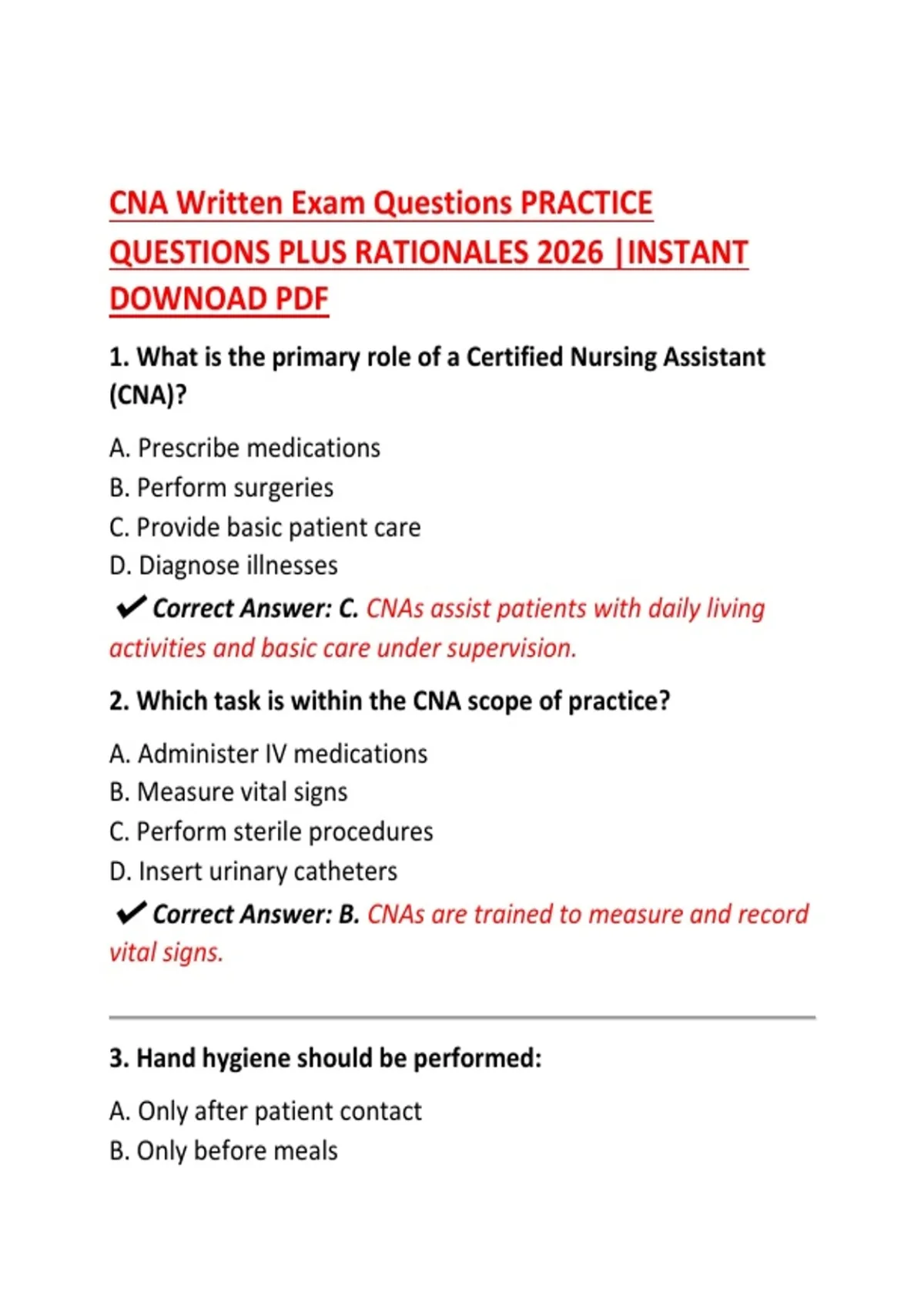 Complete 2026 study resource for aspiring Certified Nursing Assistants (CNAs). Includes practice questions with detailed rationales to strengthen knowledge of patient care, safety protocols, and clinical procedures. Ideal for exam preparation, skill mastery, and boosting confidence for the CNA written exam.