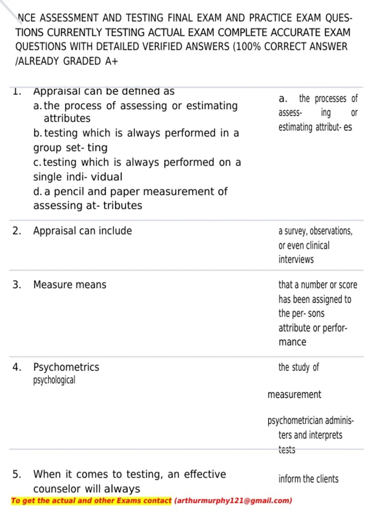 , NCE ASSESSMENT AND TESTING FINAL EXAM AND PRACTICE EXAM QUES-
