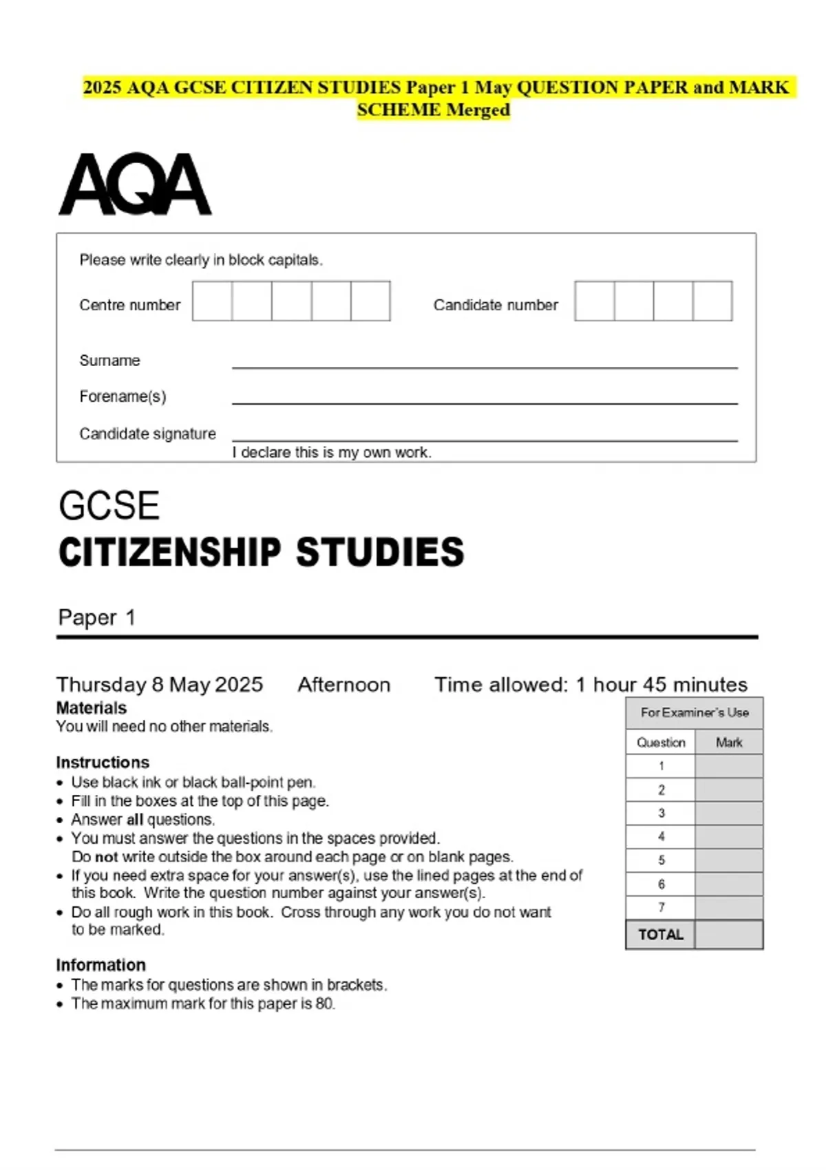 2025 AQA GCSE CITIZEN STUDIES Paper 1 May QUESTION PAPER and MARK SCHEME Merged
